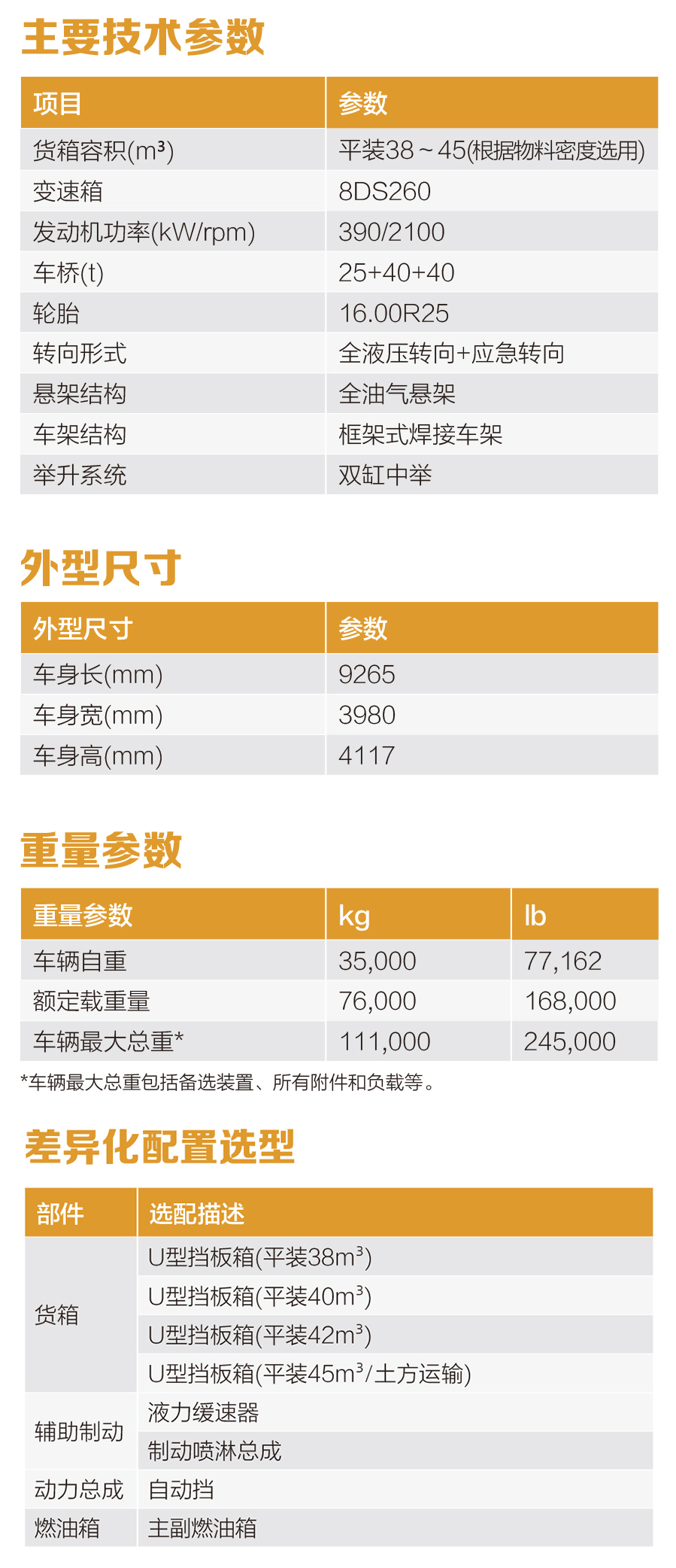 · 标准载重量76吨,货箱平装容积38-45m³,超载能力>20%