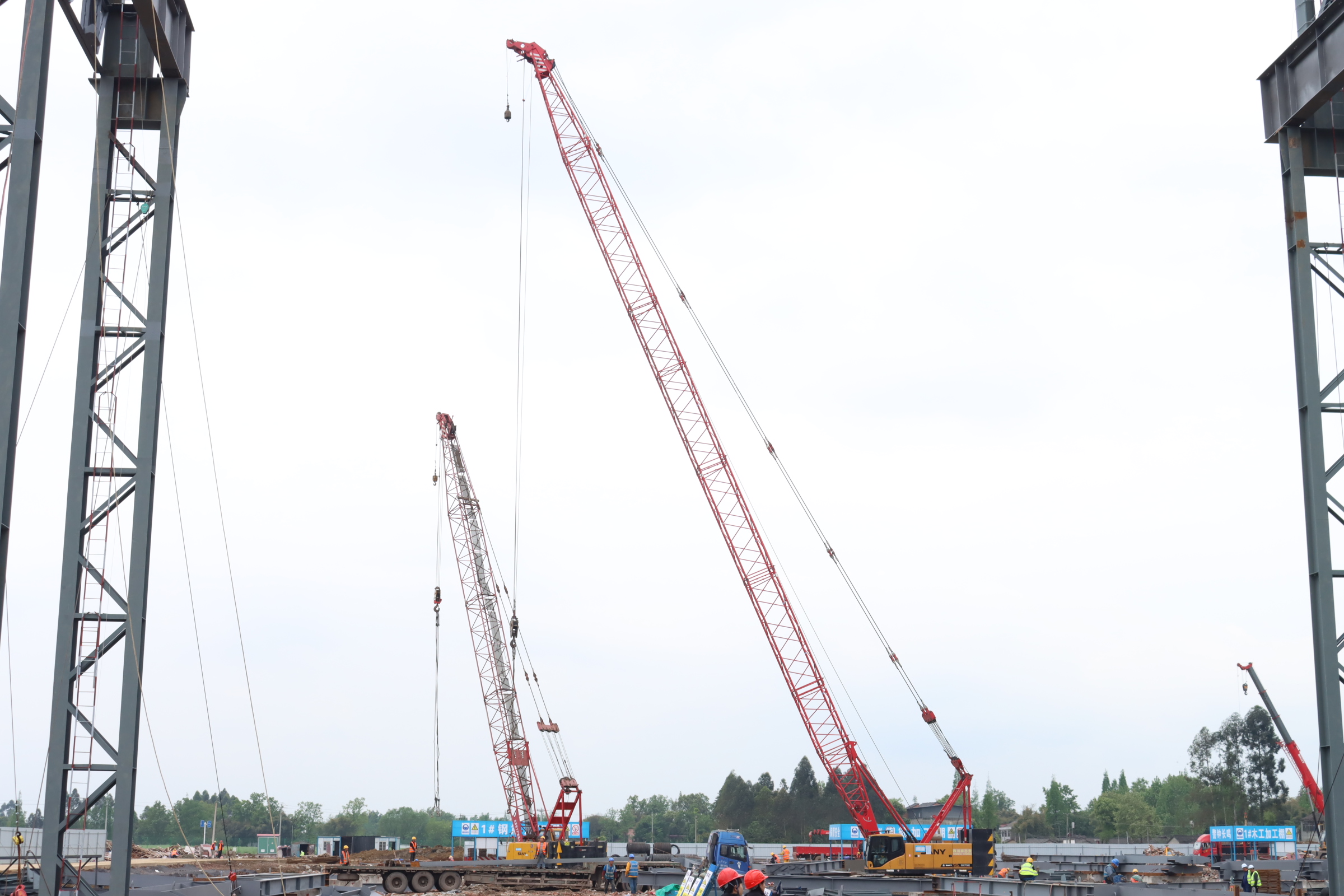 四川城市之星机械安装有限公司设备负责人唐主任介绍:“项目钢结构总吊装重量达25000吨,单个主体钢结构重达64吨,吊载高度达到了50米。现场,纵横交错的钢梁钢柱间最小仅预留了5-8米的网格状作业面。体量大、难度高,这对吊装设备提出了新的要求。”