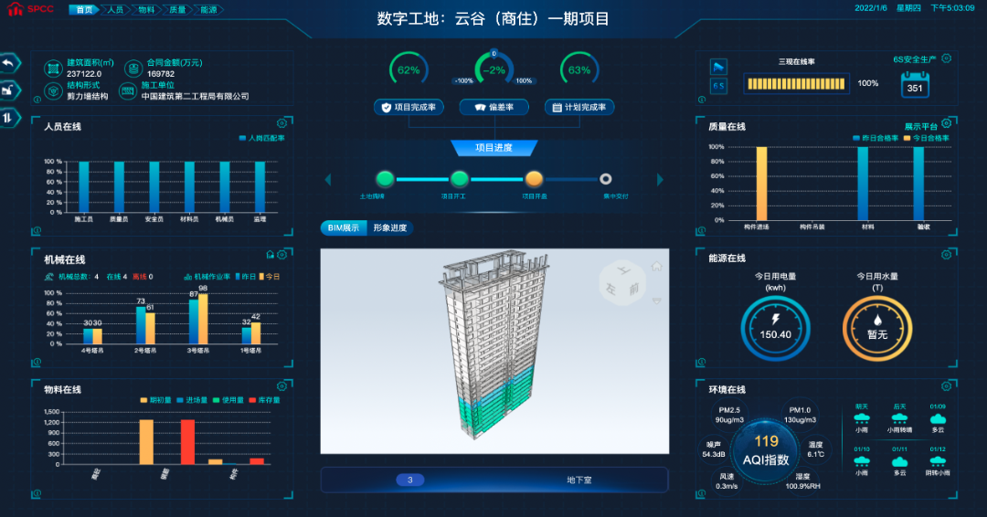 项目施工过程中通过数字工地驾驶舱将业主、监理、施工等角色间建立网络连接,构件平台生态。可直观呈现项目概况及人员、进度、质量、安全、成本等关键指标,项目情况可视。