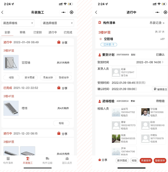 平台提供的施工管理数字化工具可基于单个构件的施工模拟,实现要货协同、进场验收、吊装施工、安装验收等施工全过程管理,实现构件全生命周期追踪溯源与 BIM 孪生交付。