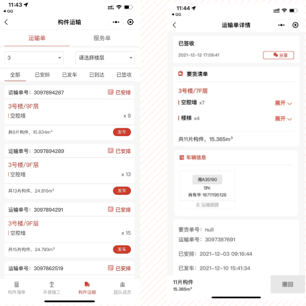 云谷项目施工员在构件吊装之前进行要货。工厂实时收到要货信息,根据要货计划安排发货,构件从工厂发出,系统智能识别运输车辆驶离工厂与驶入项目现场,自动改变运输单状态并及时通知有关人员。当构件运输车辆到达工地附近,施工员组织质量、物资人员和监理对构件进行进场验收,合理安排人员机械准备卸车吊装。