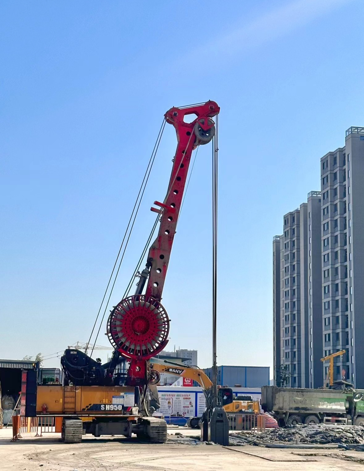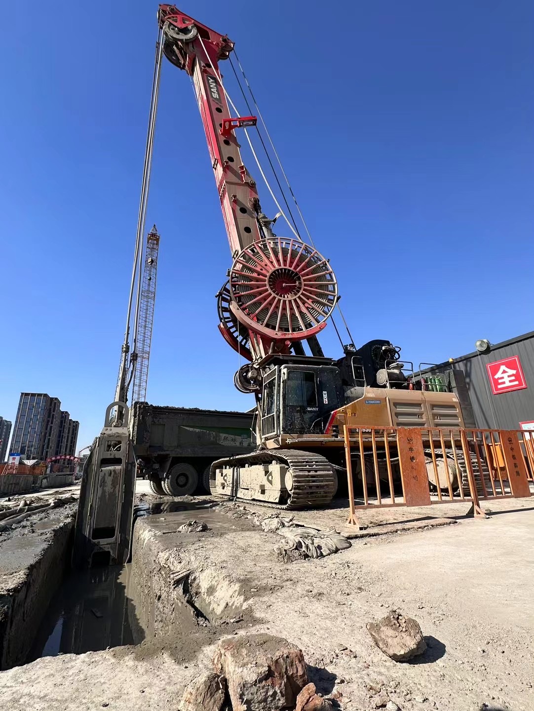 墙厚1m、宽度6.8m、深度56m,共70多幅墙。由于地层复杂、难度大、工期紧,客户选用好体育投注官网抓斗SH950一抓到底。