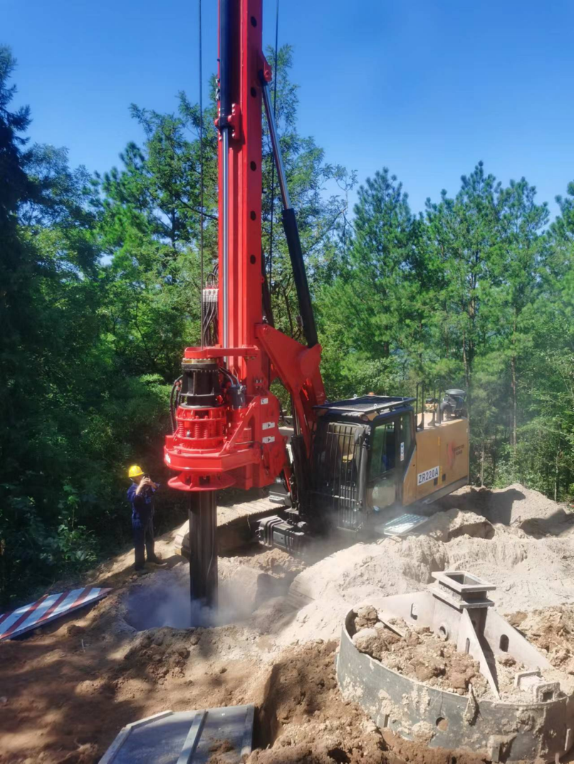 施工地点位于山岭之间,桩位在山顶,道路狭窄,需要挖机修路,运输则通过“前四后八”车辆,一般的长途板车由于长度限制无法进场。