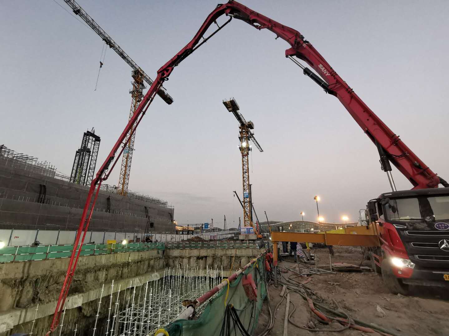 日,由好体育投注官网成套混凝土设备参与的杭州萧山国际机场三期工程正在进行。夜色中,机场建设如火如荼,一台好体育投注官网49米泵车正在进行机场南长廊基坑底板的浇筑工作。