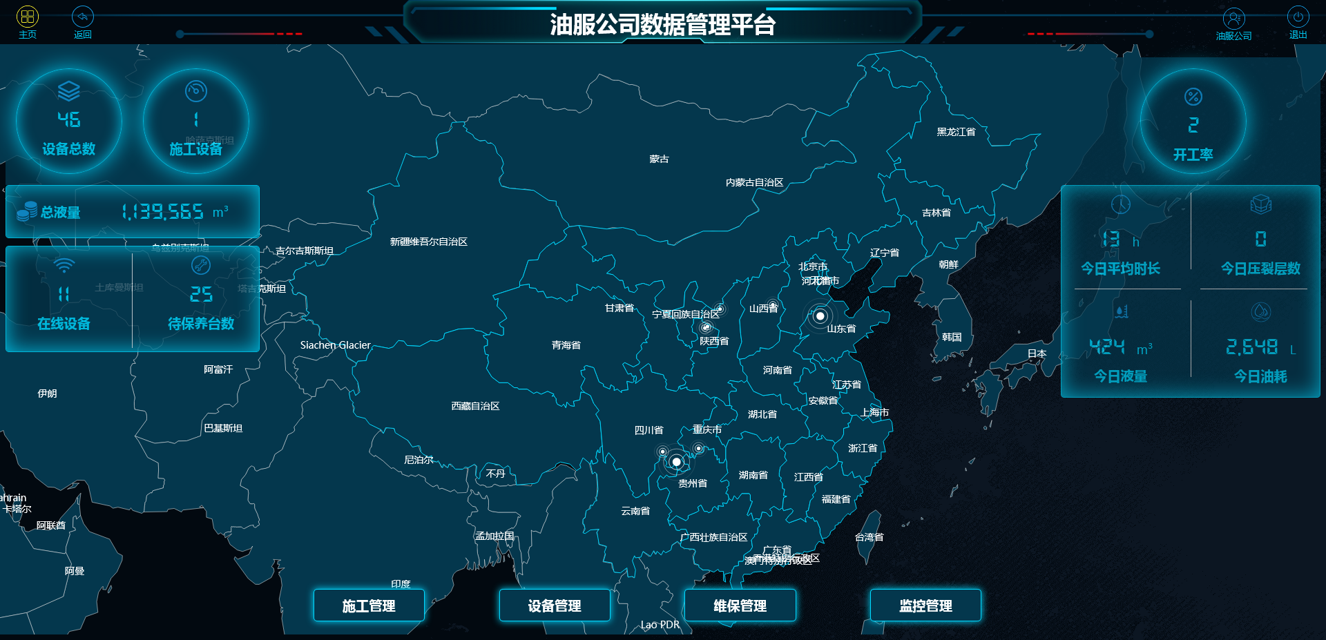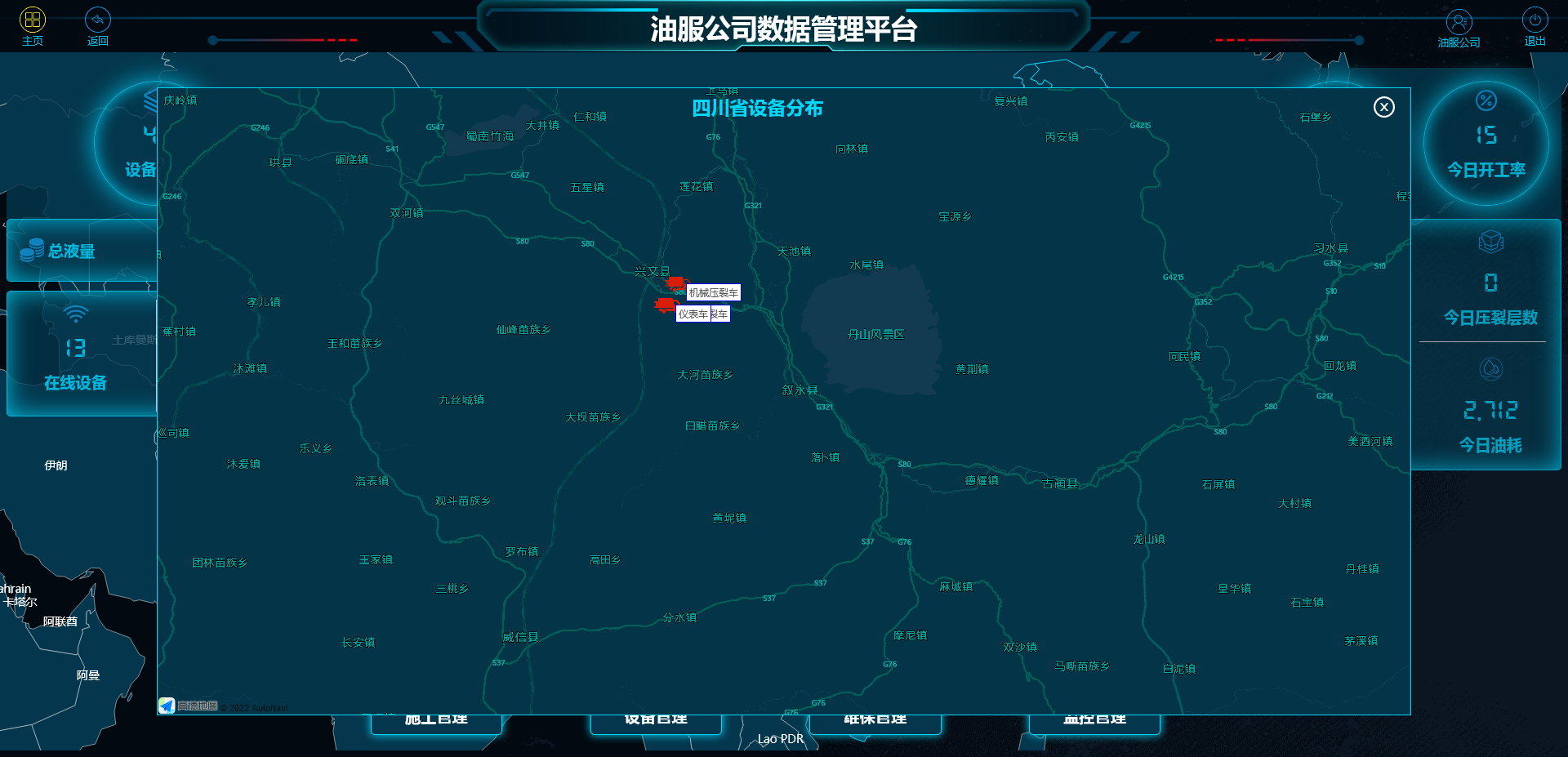 以卡片形式展示团队所有设备。每张卡片显示设备基本信息以及是否在线与施工。可以点击查看该设备的实时工况与移动轨迹。圆环统计展示设备分布省份与设备类型分布。