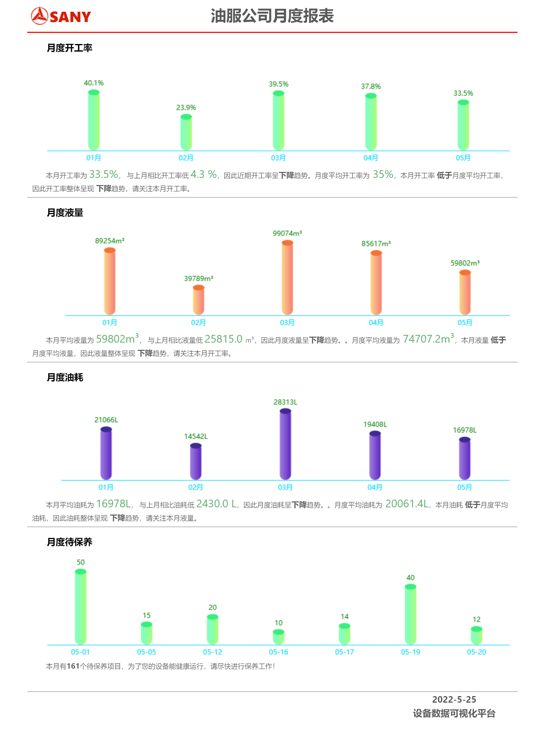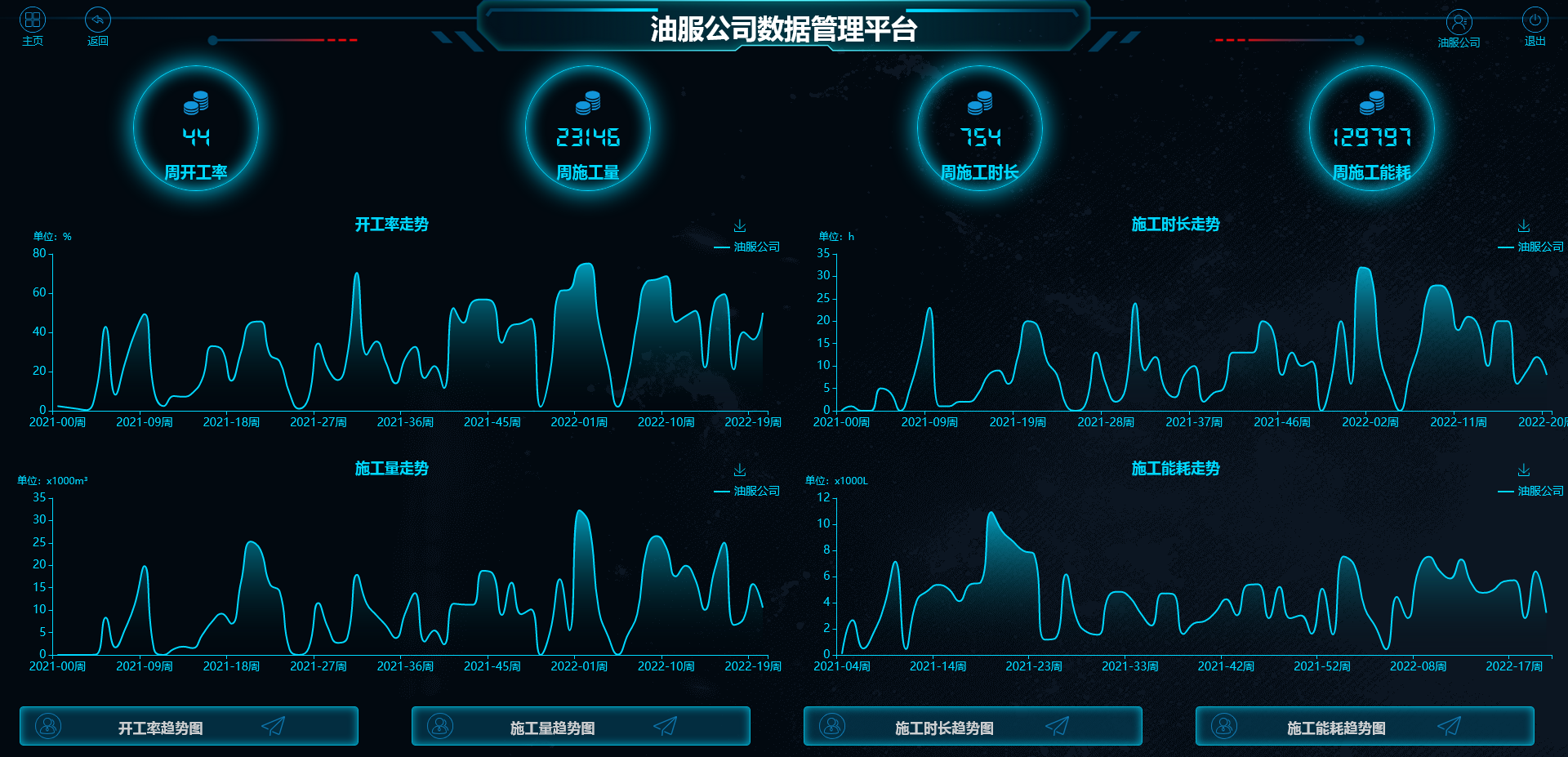 三是施工管理:施工管理可以查看客户施工曲线,包括开工率、工作时长、液量、油耗等。维保管理可以查看设备待保养信息与已保养信息,设备报警信息与已处理报警信息。客户可以查看施工曲线,并可以根据日、周、月进行切换选择,根据施工曲线掌握生产情况并作出调整。