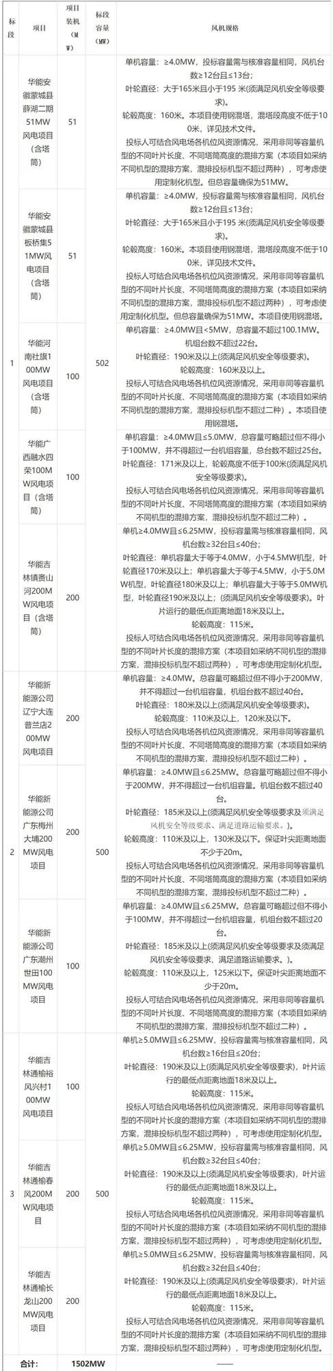从“风芒能源”获悉,5月24日,华能蒙城县薛湖二期风电场项目等11个风电项目共计1502MW风机采购开标。项目共分3个标段,一标段5个项目含塔筒,二、三标段共6个项目不含塔筒。