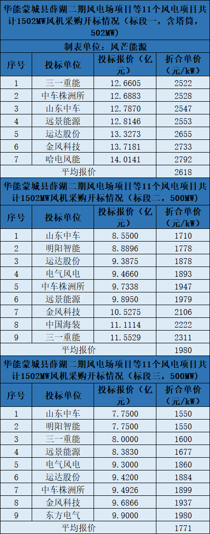 3个标段共有7-9家整机商竞标。项目最低报价为标段三的1550元/kW折合单价。根据招标公告,标段三3个风电项目均在吉林通榆,机组要求单机容量≥5.0MW且≤6.25MW。