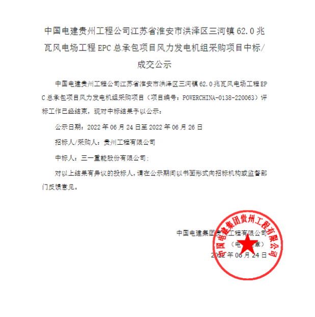 中国电建贵州工程公司江苏省淮安市洪泽区三河镇62.0兆瓦风电场工程EPC总承包项目风力发电机组采购项目中标/成交公示