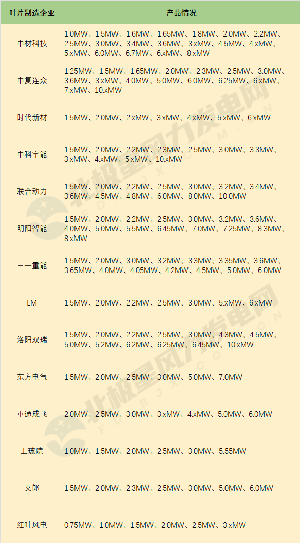 据北极星风力发电网统计,目前各叶片企业产品系列如下: