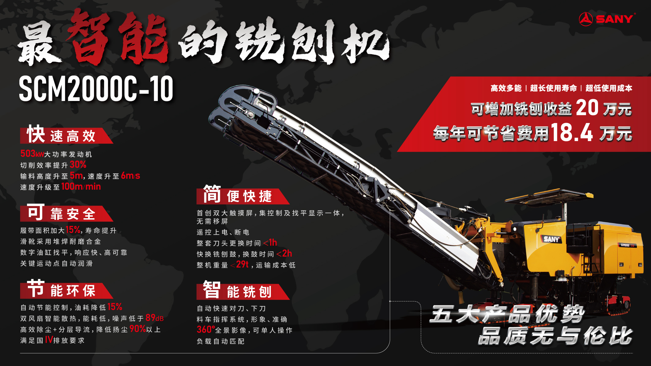 本次发布的好体育投注官网王牌两米铣刨机搭载全新升级的康明斯503KW大功率发动机,动力澎湃强劲且满足国四标准的排放要求,数字仿真优化的好体育投注官网最新一代铣刨鼓,切削效率提高20%;负载自适应技术,自动匹配发动机转速,行驶、输料、风扇速度及洒水量,整机配备360全景影像,双十寸大触摸屏、自动下刀、遥控开关、料车声光指挥功能、水位灯光指示、无插销式尾门,实现单人操作;独立通道除尘,降低90%以上的扬尘,分仓隔音,操控噪声低于89分贝,真正实现了智能铣刨。