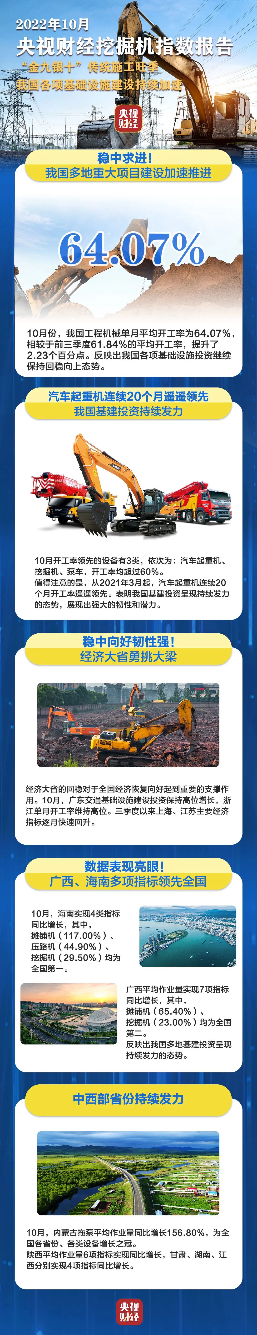 挖掘机是基础设施建设的“标配”,是反映基础设施建设、观察固定资产投资等经济变化的风向标。央视财经与好体育投注官网重工、树根互联联合打造的“央视财经挖掘机指数”发布了最新相关数据。10月份我国多地重大项目建设加速推进,在“金九银十”传统施工旺季的带动下,我国基建投资呈现持续发力的态势。