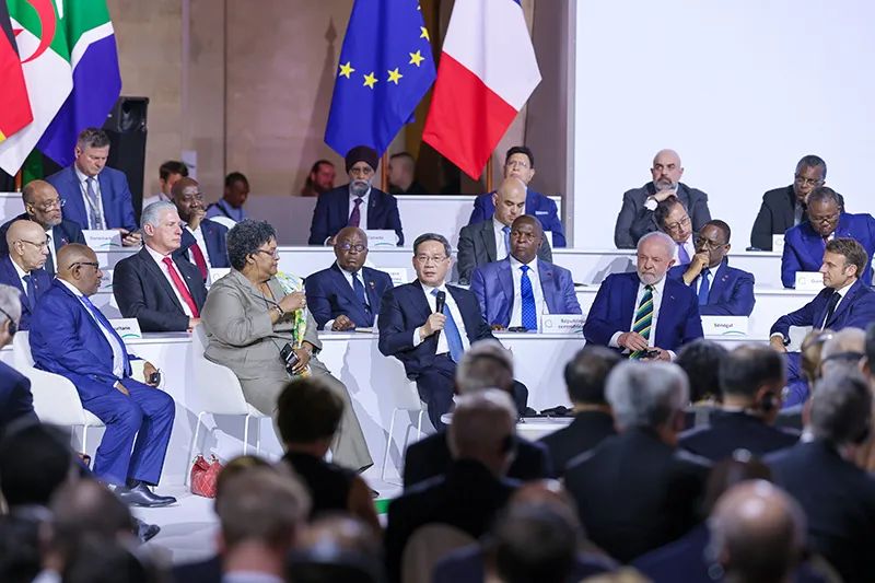 当地时间6月23日上午,国务院总理李强在巴黎出席新全球融资契约峰会闭幕式并发表讲话。法国总统马克龙主持会议,60多位国家元首、政府首脑和主要国际组织负责人出席。