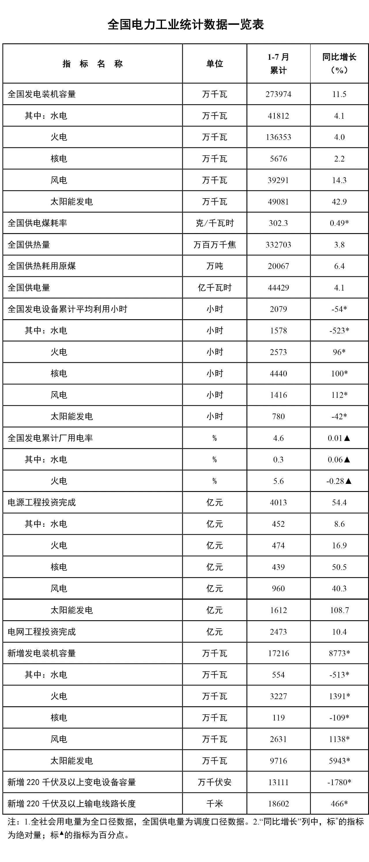 中国风电新闻网讯:8月17日,国家能源局发布1-7月份全国电力工业统计数据。
