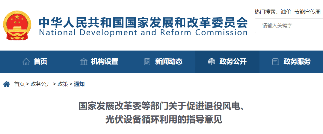 国家发展改革委等部门关于促进退役风电、光伏设备循环利用的指导意见