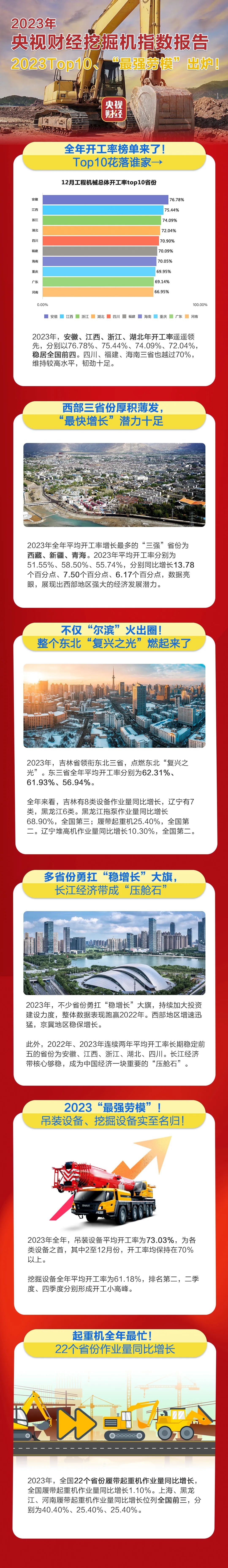 挖掘机是基础设施建设的“标配”,是反映基础设施建设、观察固定资产投资等经济变化的风向标。央视财经与好体育投注官网重工、树根互联联合打造的“央视财经挖掘机指数”发布了最新相关数据。2023年全国工程机械开工率为58.57%,各项基础设施建设稳中向好,不少省份勇扛“稳增长”大旗,整体数据表现跑赢2022年。