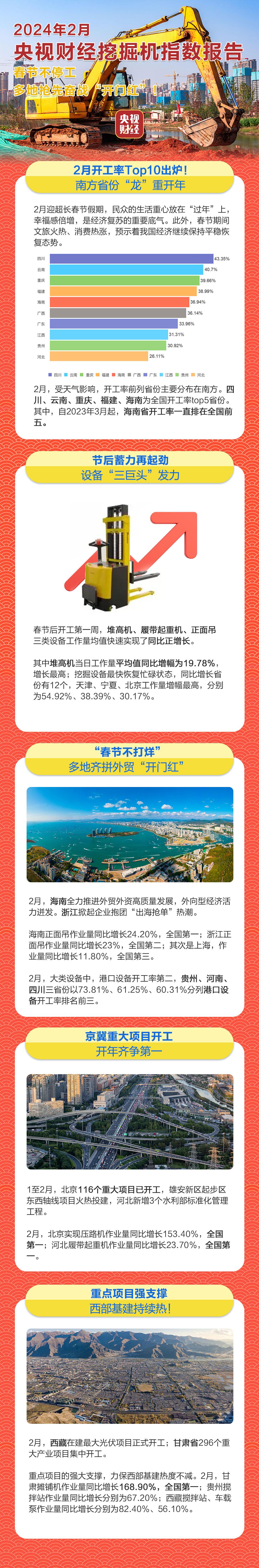 挖掘机是基础设施建设的“标配”,是反映基础设施建设、观察固定资产投资等经济变化的风向标。央视财经与好体育投注官网重工、树根互联联合打造的“央视财经挖掘机指数”发布了最新相关数据。春节前后多地重大项目不停工,抢先奋战“开门红”。