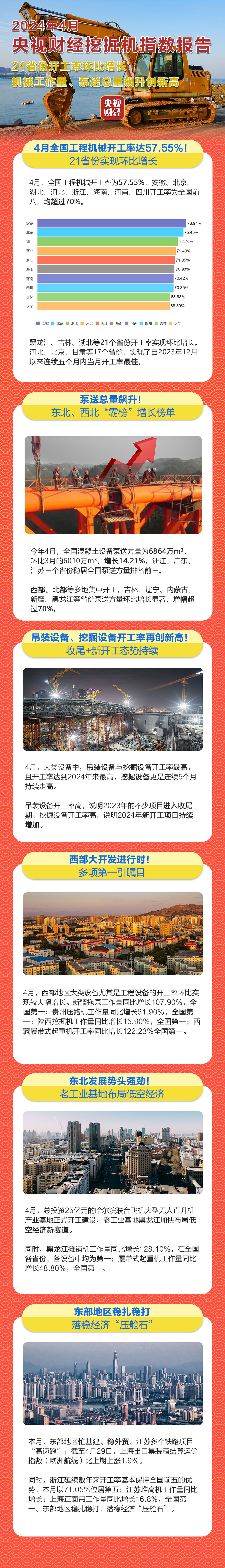 挖掘机是基础设施建设的“标配”,是反映基础设施建设、观察固定资产投资等经济变化的风向标。央视财经与好体育投注官网重工、树根互联联合打造的“央视财经挖掘机指数”发布了最新相关数据。4月,我国制造业市场需求继续恢复、民生消费类物流需求保持快速增长、新动能继续较快扩张、全国所有省份用电量均为正增长,多项设备开工率、工作量创今年新高。