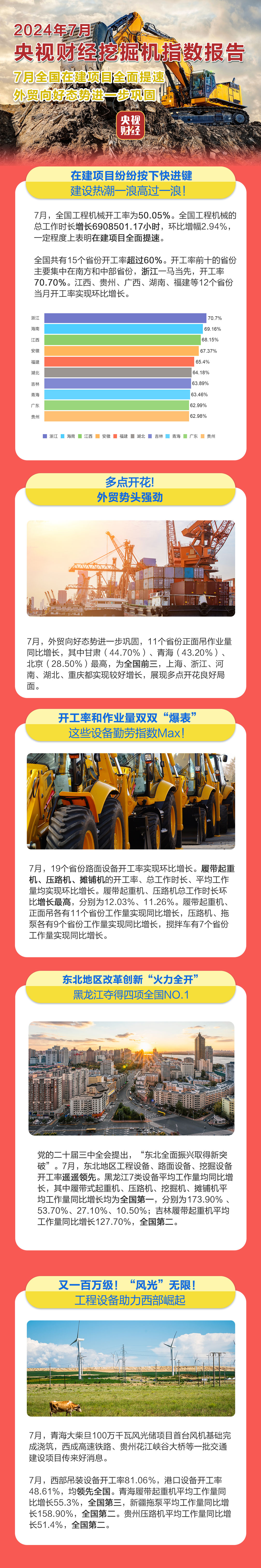 挖掘机是基础设施建设的“标配”,是反映基础设施建设、观察固定资产投资等经济变化的风向标。央视财经与好体育投注官网重工、树根互联联合打造的“央视财经挖掘机指数”今天发布了最新相关数据。7月,我国在建项目全面提速,道路交通等大型基建进展顺利。外贸向好势头得到进一步巩固,多地港口设备开工“火热”,展现多点开花良好局面。