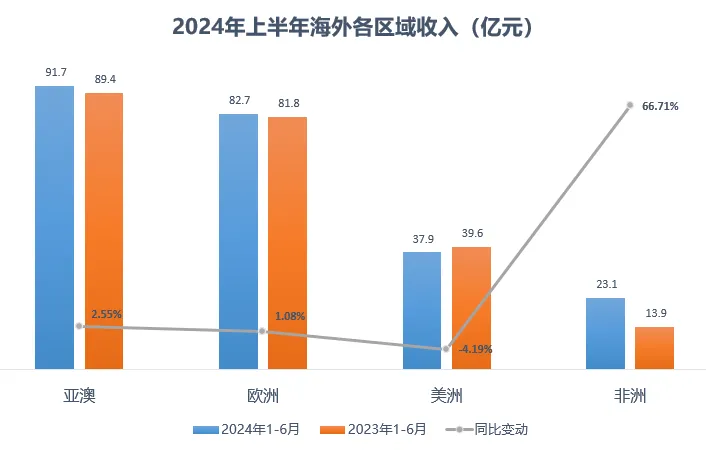 各区域收入情况如下:亚澳区域91.7亿元,增长2.55%;欧洲区域82.7亿元,增长1.08%;美洲区域37.9亿元,下降4.19%;非洲区域23.1亿元,增长66.71%。
