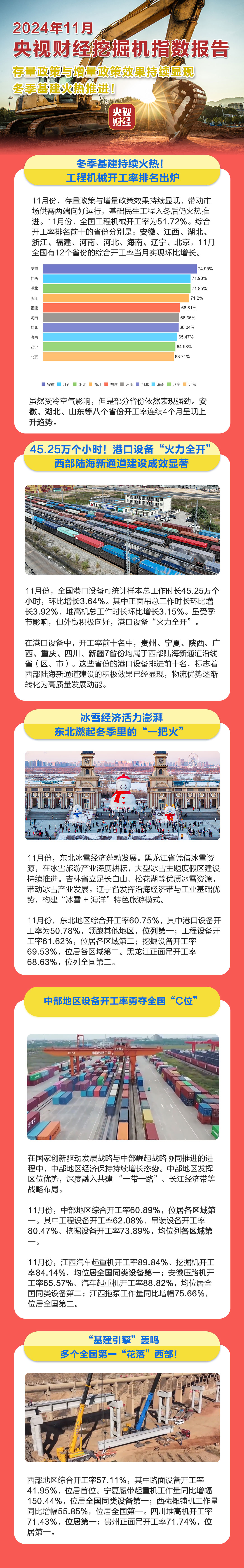 挖掘机是基础设施建设的“标配”,是反映基础设施建设、观察固定资产投资等经济变化的风向标。央视财经与好体育投注官网重工、树根互联联合打造的“央视财经挖掘机指数”发布了最新相关数据。11月份,存量政策与增量政策效果持续显现,带动市场供需两端向好运行,基础民生工程入冬后仍火热推进。
