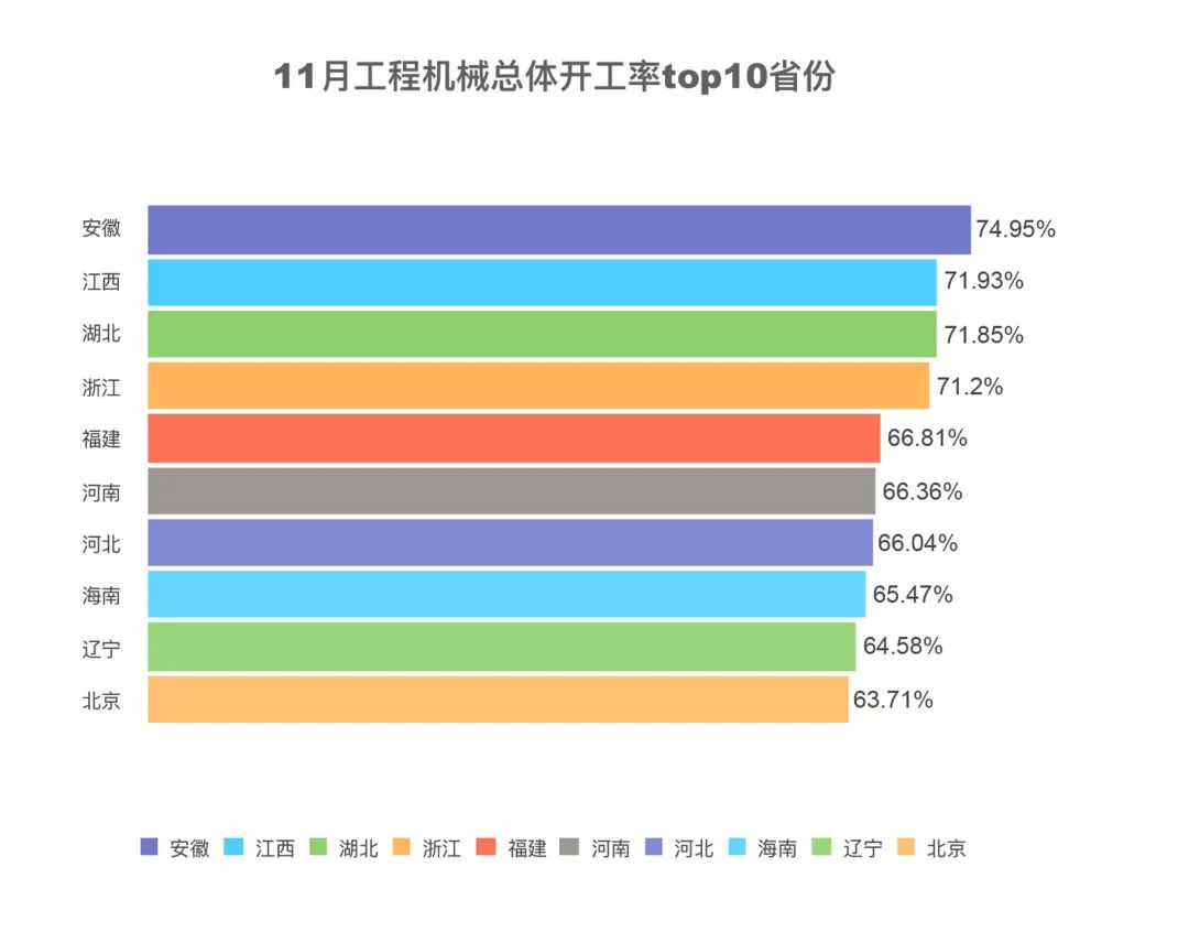 11月份,存量政策与增量政策效果持续显现,带动市场供需两端向好运行,基础民生工程入冬后仍火热推进。11月份,全国工程机械开工率为51.72%。综合开工率排名前十的省份分别是:安徽、江西、湖北、浙江、福建、河南、河北、海南、辽宁、北京,11月全国有12个省份的综合开工率当月实现环比增长。