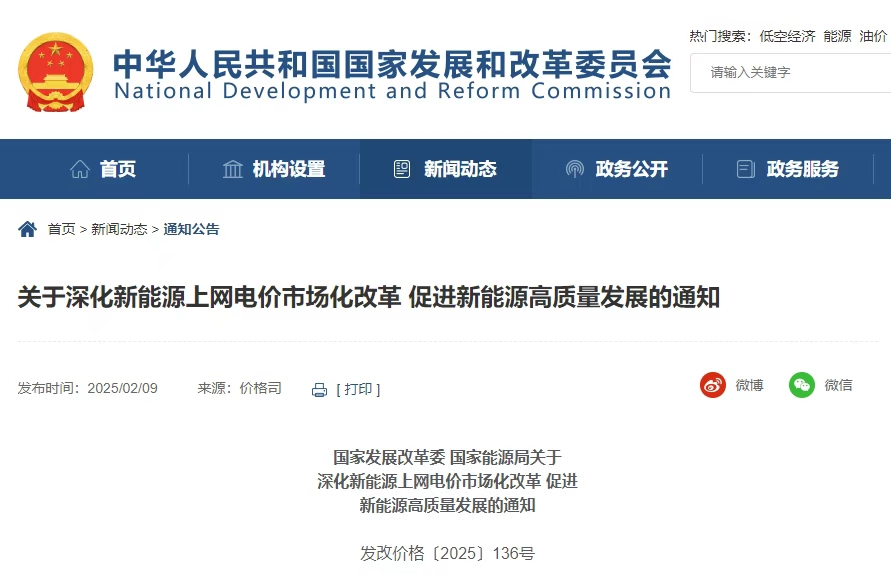 2月9日,国家发展改革委、国家能源局联合发布了《关于深化新能源上网电价市场化改革 促进新能源高质量发展的通知》(以下简称《通知》),推动风电、太阳能发电等新能源上网电量全部进入电力市场,上网电价通过市场交易形成。