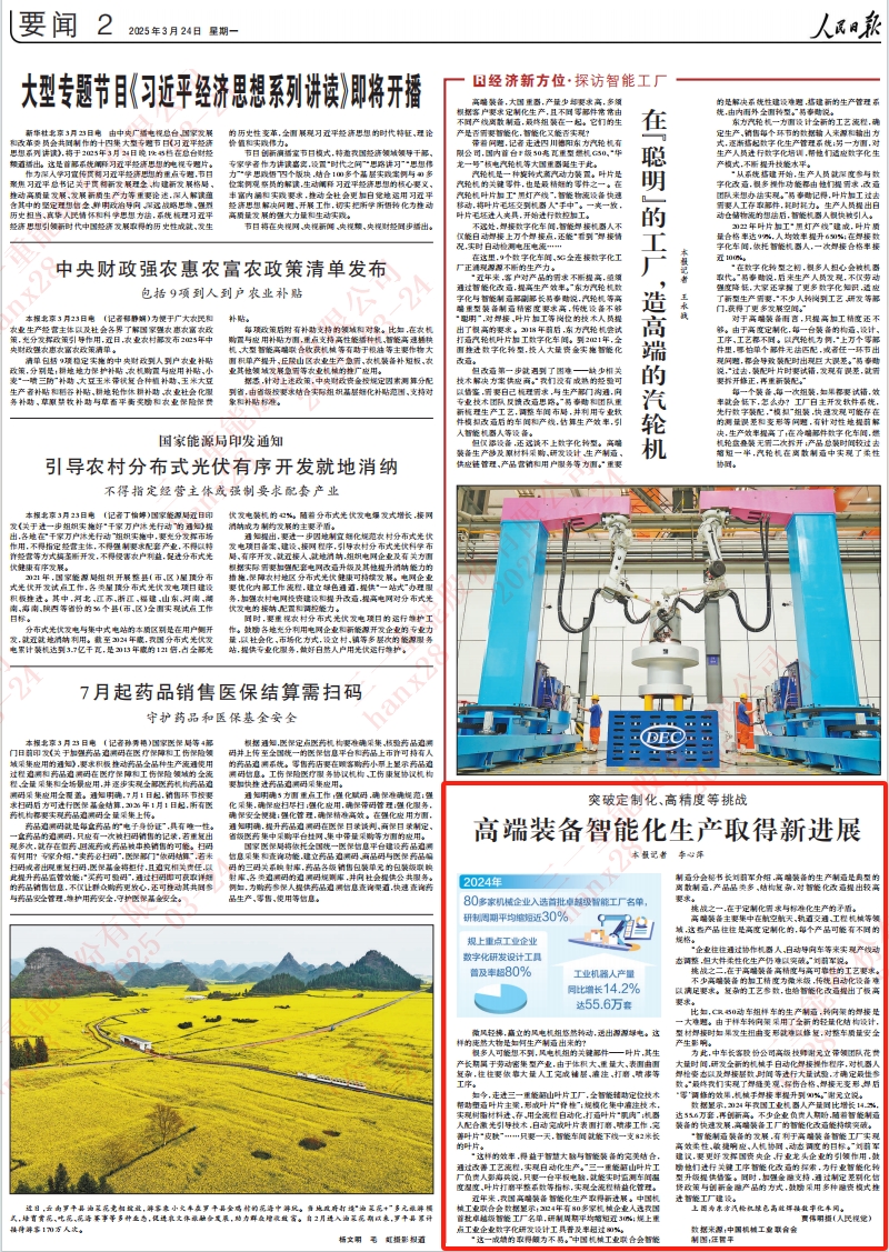 近年来,我国高端装备智能化生产取得新进展。中国机械工业联合会数据显示:2024年有80多家机械企业入选我国首批卓越级智能工厂名单,研制周期平均缩短近30%;规上重点工业企业数字化研发设计工具普及率超过80%。