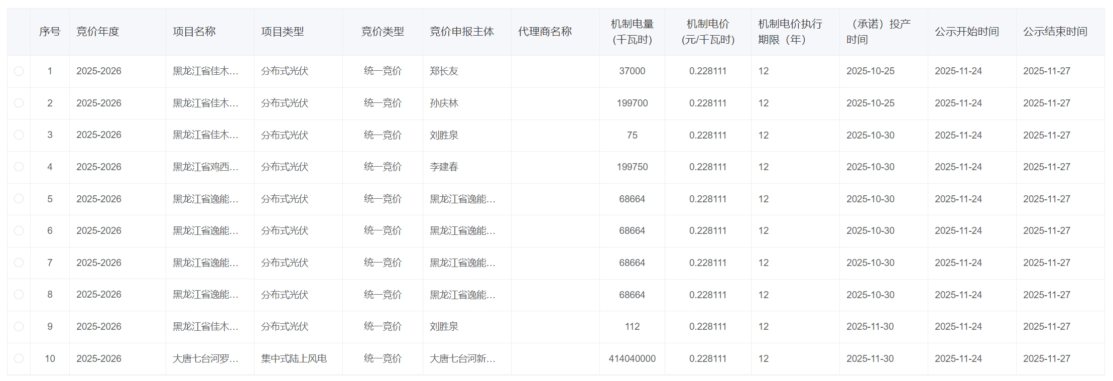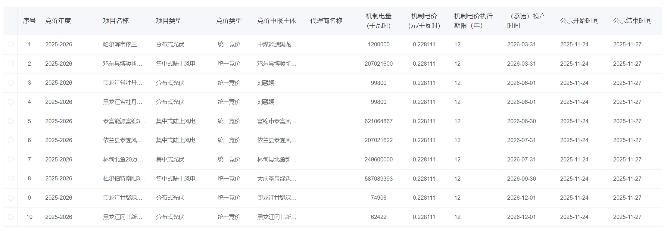 风芒能源获悉,11月24日,黑龙江2025—2026机制电价竞价结果公示。