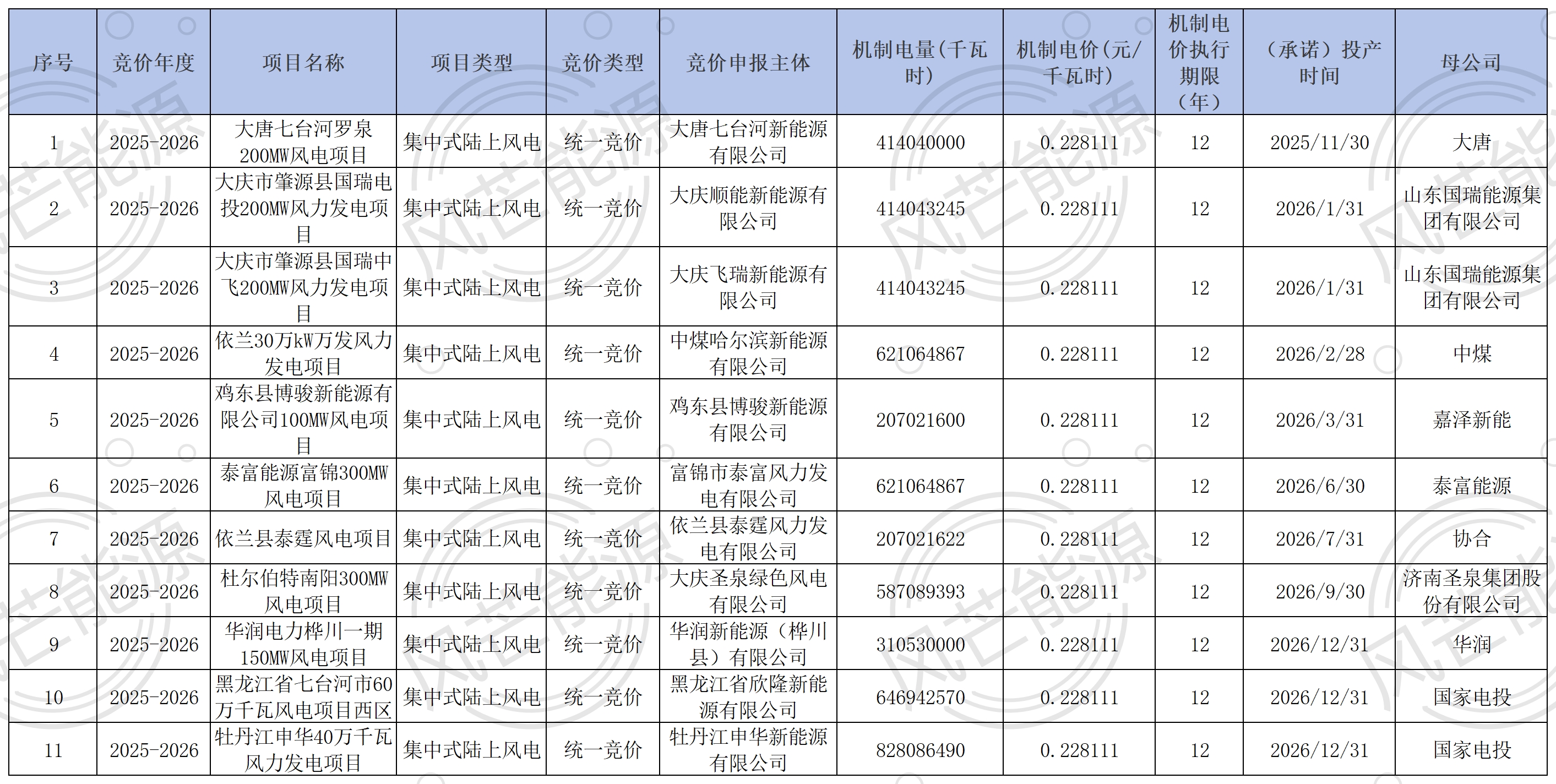黑龙江增量风、光竞价结果:统一竞价,电价均为0.228111元/kWh,风电业主涉及大唐、国家电投等