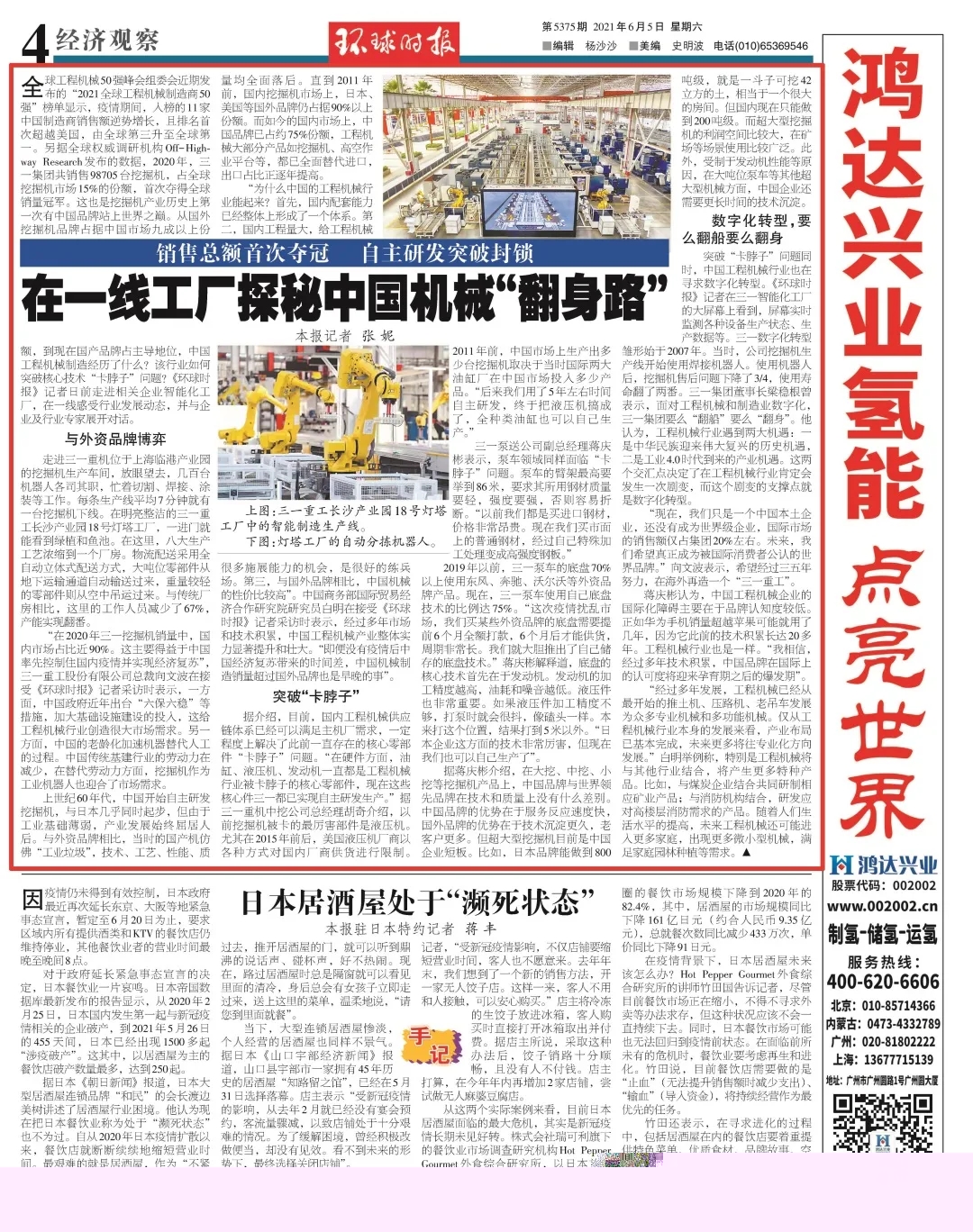 6月5日,《环球时报》以《在一线工厂探秘中国工程机械“翻身路”》为题,大篇幅报道好体育投注官网挖掘机2020年销量夺冠全球背后的故事。
