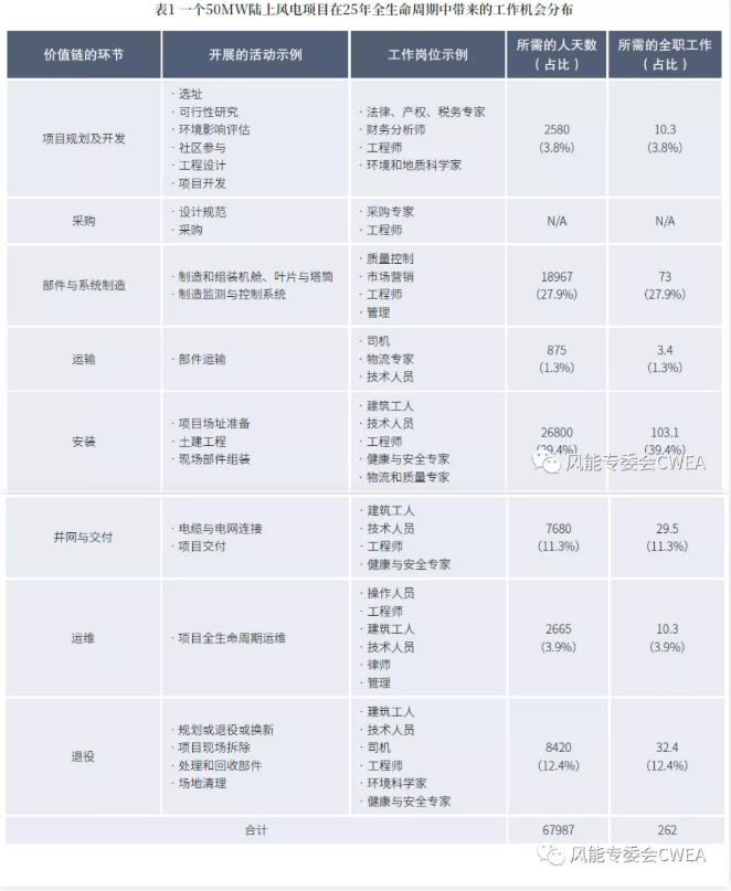 目前, 全球风电装机规模排名靠前的几个国家的风电直接从业人数合计达到数十万。根据全球风能理事会市场情报(GWEC MarketIntelligence)开展的一项全球性调查,截至2020年,中国的风电从业人数约为55万,巴西为26万,美国为11.5万,印度为6.3万。如果2021—2025年的470GW风电新增装机能够按时交付,全球风能理事会(GWEC)预计这些装机在全生命周期中将带来超过330万个工作机会。该测算是基于国际可再生能源署(IRENA) 关于陆上风电及海上风电项目创造工作岗位能力的计算(2017年及2018年)以及全球风能理事会(GWEC)对于未来风电市场增长的预测。需要注意的是,上述测算未考虑可能影响就业岗位创造的部分因素,比如技术进步、本地的健康与安全要求、国内劳动生产率以及规模经济。国际可再生能源署(IRENA)的研究显示,一个典型的50MW陆上风电项目在其25年全生命周期中,单位兆瓦装机将带来5.24个工作机会。一个典型的500MW海上风电项目在其25年全生命周期中,单位兆瓦装机会带来17.29人年(person-years)的工作机会。此类研究反映出到目前为止风电在创造就业方面的良好表现。比如,英国赫尔(Hull)地区通过发展风电机组组装业务,创造出超过1000个直接本地就业岗位。2020年,丹麦劳工运动经济委员会(Economic Council of the Labour Movement in Denmark)与丹麦工人联合会(United Federationof Danish Workers)发布的一份报告指出,与建立生物精炼厂以及取代燃油燃气锅炉等相比,海上风电开发带来的永久工作机会是最多的。在带动通常远离城市经济中心的沿海社区发展方面,海上风电能够发挥出特殊的价值。扩大本地就业规模与加快工业发展有助于推动这些地区的经济繁荣。纽约州能源研究和开发管理局(NYSERDA)对美国海上风电创造就业岗位情况的研究显示,在一个海上风电项目全生命周期所需要开展的工作中,2/3都可以由美国工人来完成。即便如此,由于缺少本地生产设施和训练有素的劳动力等,并不是所有的市场都十分重视价值链中的采购与制造环节。对于此类产业链发展仍处于前期阶段的市场而言,突出这样的路径是至关重要的,即利用已有的能力、专长以及产业来让本地价值创造最大化。在那些依赖进口部件的市场中,风电的安装、并网、运维和退役工作仍需要由本国工人完成。为了在这些地区最大限度地发挥好短期的创造就业潜力,在国内市场识别出“准备充分”(shovel-ready)的项目,比如获得规划许可及进入工程准备阶段(pre-construction stage)的项目,就变得十分关键。一旦生产与运营能力得到恢复,就可以迅速推进这些项目的开发活动,并能够从本地雇用到建筑工人、司机、技术人员、工程师等。要想让那些国内制造水平较低的市场最大限度地获得风电开发的价值,就必须保持稳定、持续的“准备充分”项目的储备,这离不开高效、透明的审批许可流程。因此,有助于简化风电项目许可流程的绿色复苏行动能够释放运输、安装、交付环节中的就业创造能力。在一个陆上风电项目所需的劳动力资源中,这三个环节占到一半以上。