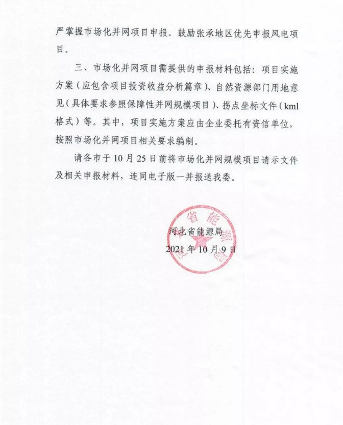 10月9日,河北省能源局发布《关于做好2021年风电、光伏发电市场化并网规模项目申报工作的补充通知》,就市场化项目申报的有关事项给出相关意见。