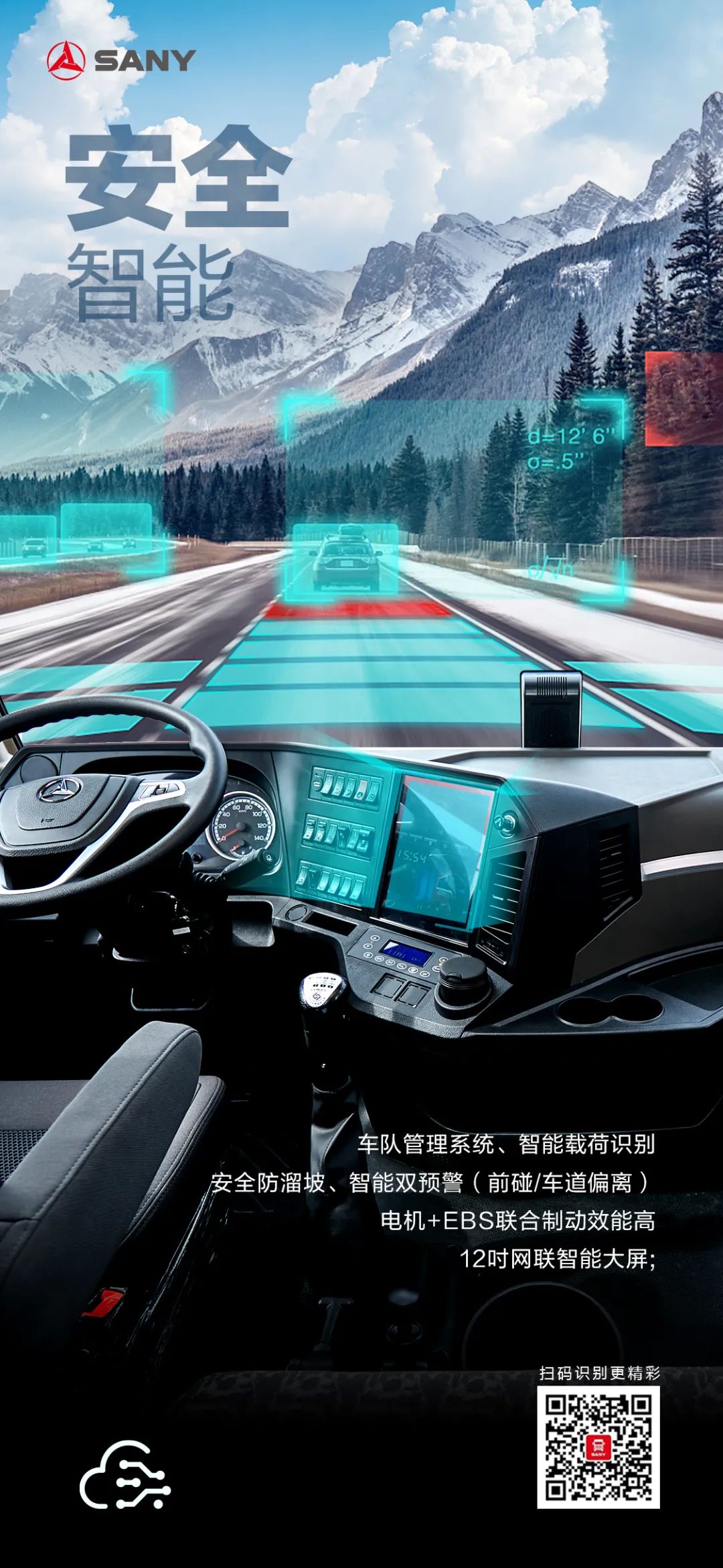 车队管理系统、智能载荷识别,安全防溜坡、智能双预警(前碰/车道偏离)、电机+EBS联合制动效能高、12吋网联智能大屏。