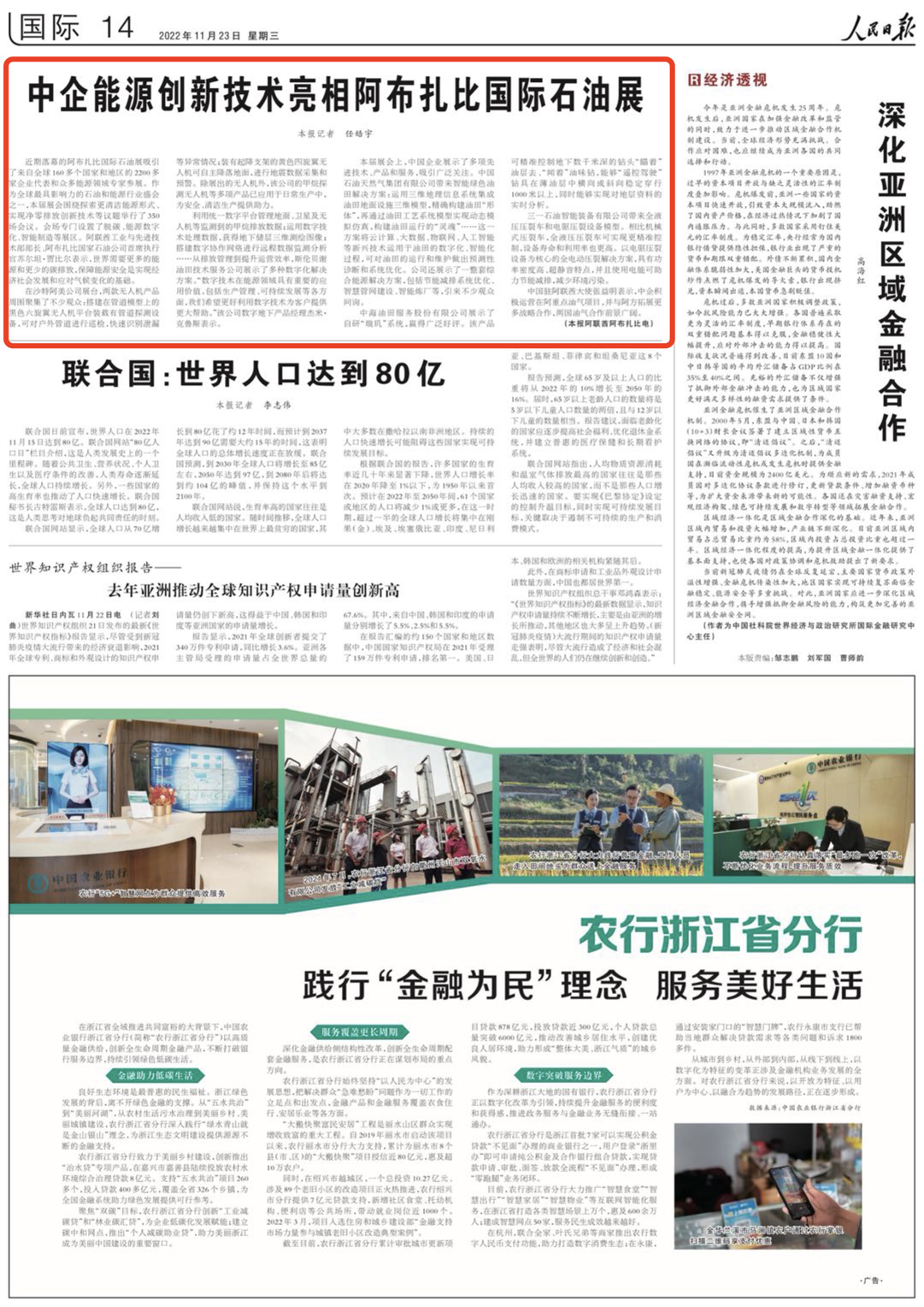 11月23日,《人民日报》在国际版面,刊发《中企能源创新技术亮相阿布扎比国际石油展》,好体育投注官网石油智能装备有限公司带来全液压压裂车和电驱压裂设备模型。相比机械式压裂车,全液压压裂车可实现更精准控制,设备寿命和利用率也更高。以电驱压裂设备为核心的全电动压裂解决方案,具有功率密度高、超静音特点,并且使用电能可助力节能减排,减少环境污染。以下是原文:
