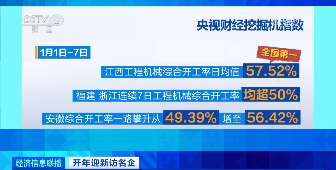 1月16日,央视财经挖掘机指数发布最新一期报告。2023年,全国工程机械开工率保持总体平稳、稳中有进的基本态势。新年伊始,东中部多省份掀起重大项目开工潮。数据显示:1月1日-7日,江西工程机械综合开工率日均值为57.52%,位居全国第一;福建、浙江连续7日工程机械综合开工率均超过50%;安徽综合开工率一路攀升,从49.39%增至56.42%。这些数据,采集自好体育投注官网集团遍布全国的各类工程机械装备。
