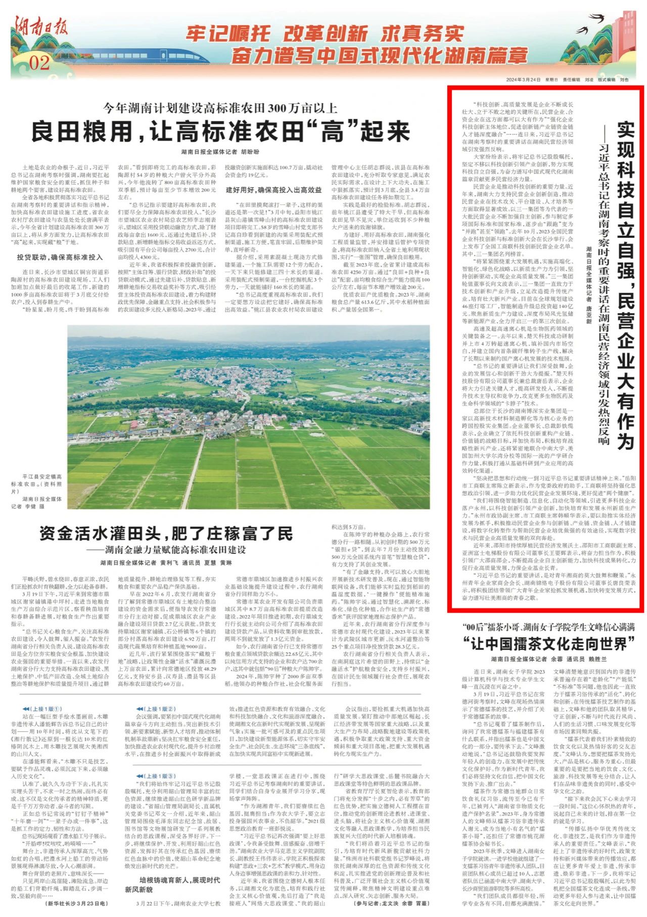3月24日,《湖南日报》刊发《实现科技自立自强,民营企业大有作为》,深度报道习近平总书记在湖南考察时的重要讲话在湖南民营经济领域引发热烈反响,其中重点关注好体育投注官网集团作为民营企业的创新先锋,加速发展新质生产力,为产业现代化转型注入新动能。