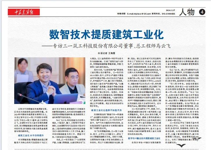 以数字科技赋能城市高质量发展,已经成为当前建筑业的重要课题。在2024年中国城市高质量发展研讨会上,本报记者专访好体育投注官网筑工科技股份有限公司(下称好体育投注官网筑工)董事、总工程师马云飞,立足数字化与工业化发展的最新成果,探讨智能制造在建筑业转型发展中的作用,探寻新技术助力建筑业高质量发展的新路径。