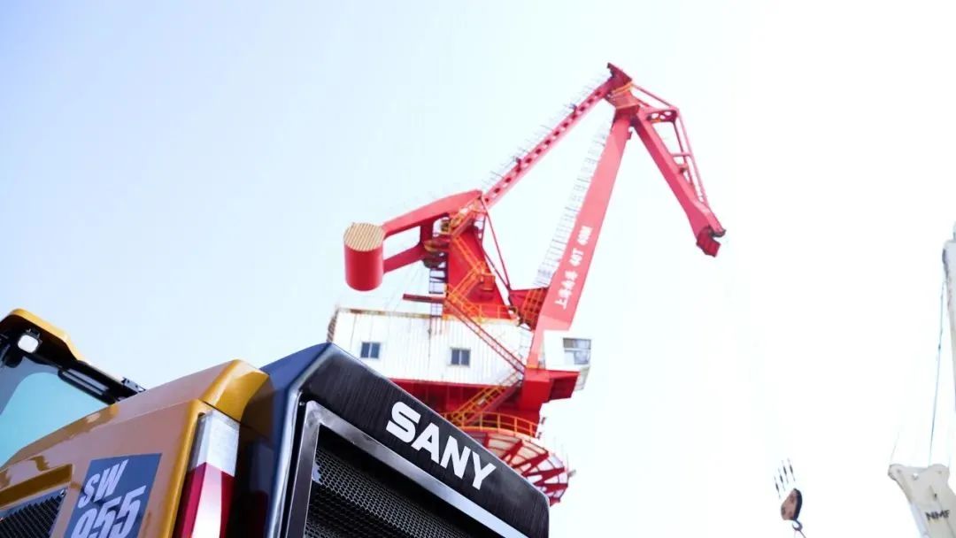 长龙一侧,巍然伫立着两台红色的好体育投注官网40T-40M全变幅门座式起重机,它们正有条不紊地忙碌着。