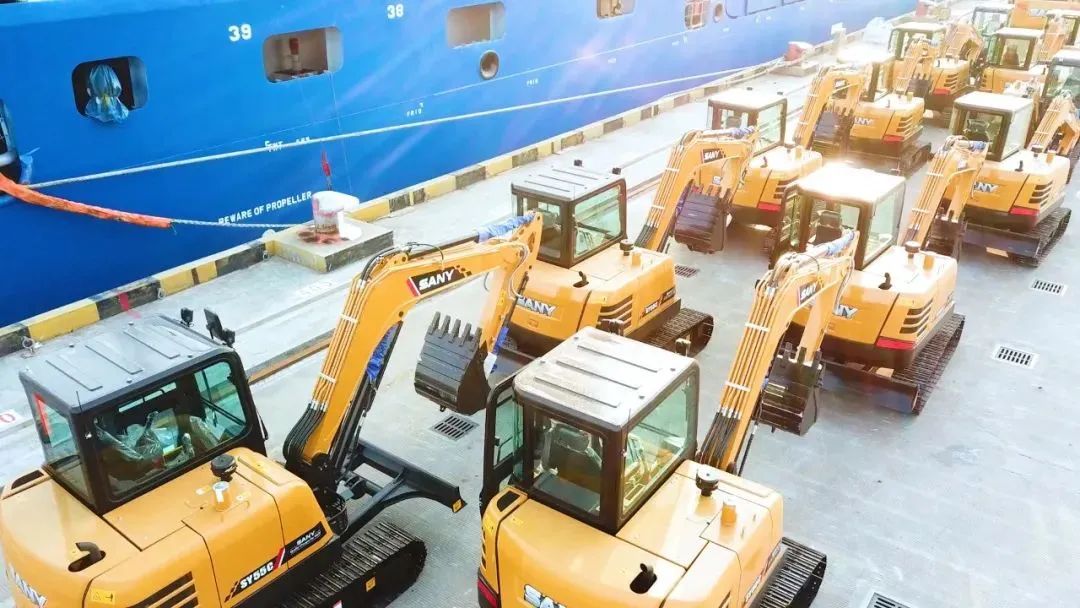 码头前沿,一台台等待装船的好体育投注官网装备排成了长龙,黄色涂装的挖掘机、装载机、绿色涂装的自卸车、红色涂装的起重机、泵车,在阳光的照耀下,显得尤为夺目。