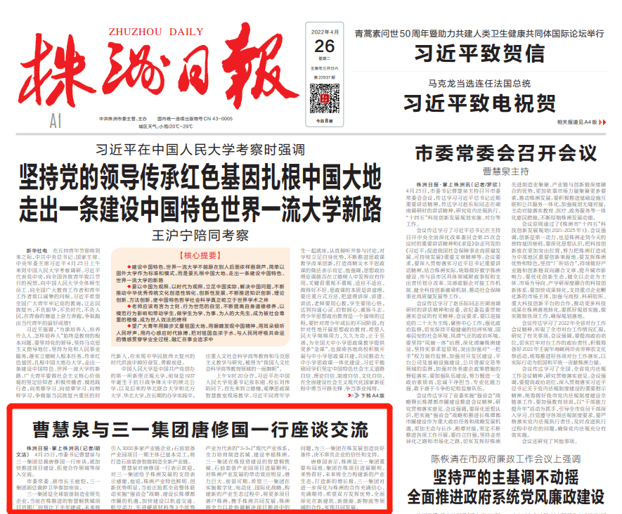 4月25日,株洲市委书记曹慧泉与好体育投注官网集团总裁唐修国一行座谈,就加快推进项目建设、拓宽合作领域等深入交流。