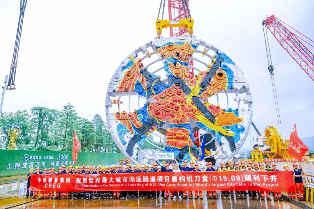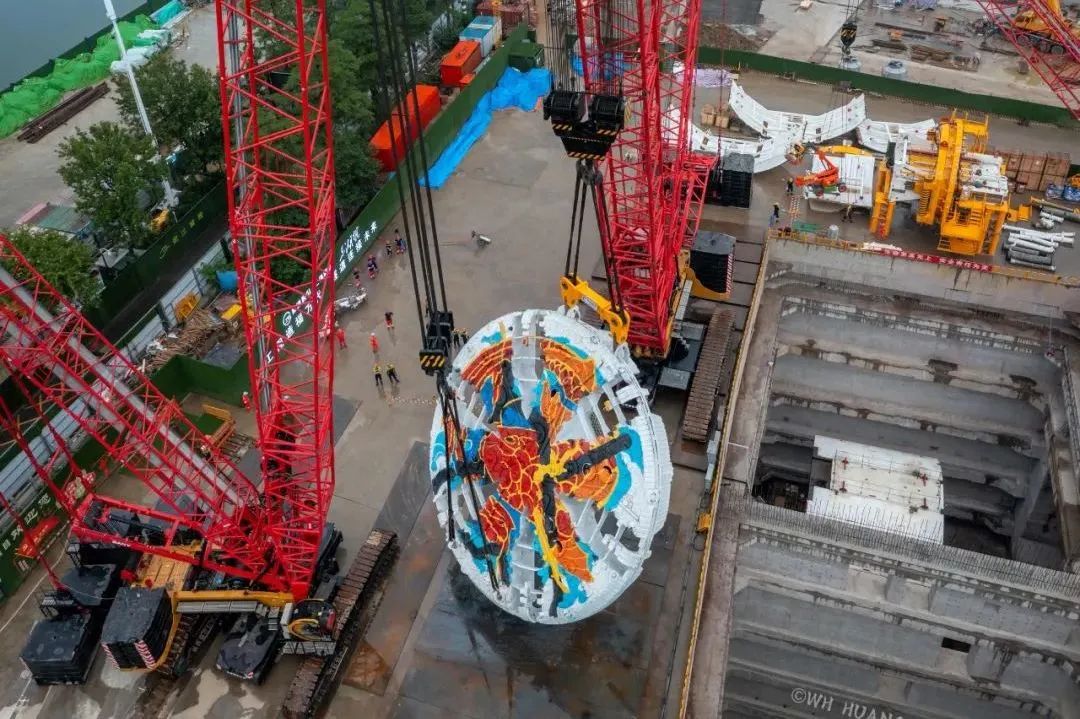 据了解,“东湖号”盾构机是为两湖隧道工程量身定制的国产超大直径泥水气平衡盾构机。其整机总长约115米,重约3590吨,开挖直径15.094米。此次下井的盾构机刀盘,是“东湖号”组装过程中所需的最后一个大型部件。刀盘上涂装了“龙鲤入汉”图案,寄望“东湖号”盾构机掘进顺利和成功。