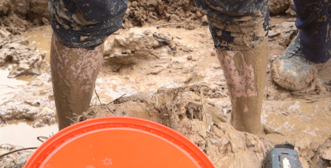 现场泥泞不堪,满是泥土,为了更好地对挖机进行检查,肖工马上抄起铁铲进行淤泥清理,胡工索性脱掉鞋子“赤脚上阵”!