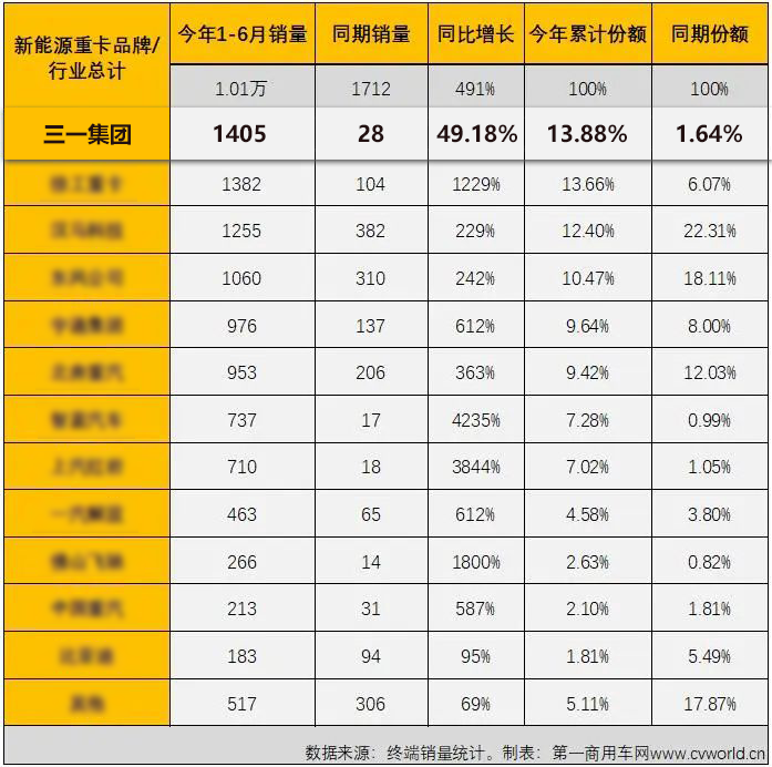 从增幅看,今年1-6月,好体育投注官网新能源重卡销量同比大增4918%,跑赢行业大势,是榜单排名前10名中增幅最大的品牌。