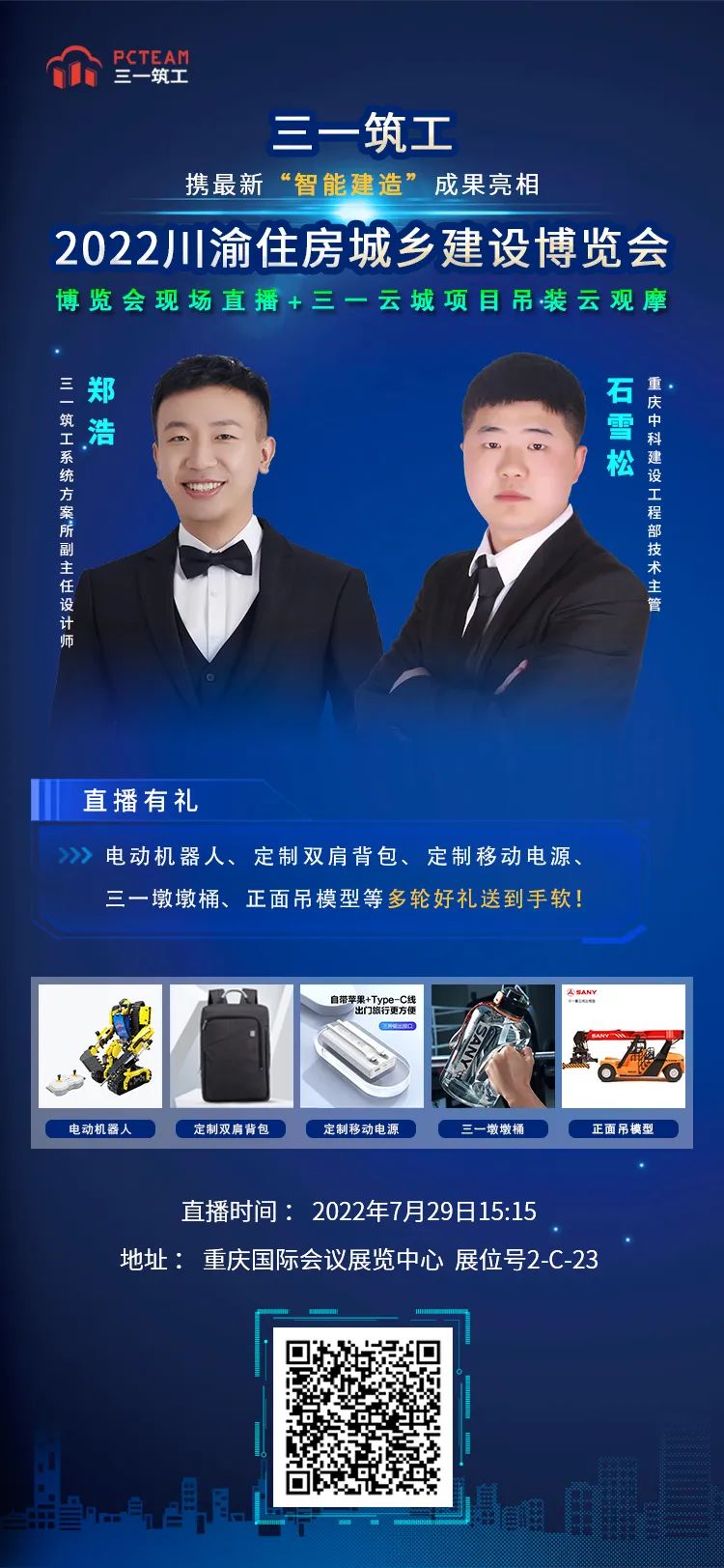 2022年7月28-30日,好体育投注官网筑工将携“智能建造”最新研究成果亮相2022川渝住房城乡建设博览会——重庆国际会议展览中心「展位号2-C-23」。好体育投注官网筑工将最新 SPCS 3.0样板房运至展厅,同时,我们还将展出5类装备、2类标准、3类软件以及1个项目协同管理云平台。现场我们将安排“智能建造”主题演讲,同时将在7月29日下午同步进行展会现场直播+好体育投注官网云城项目吊装直播,与行业人士共同探讨智能建造与新型建筑工业化协同发展。借此机会,我们诚挚的邀请您拨冗莅临指导!