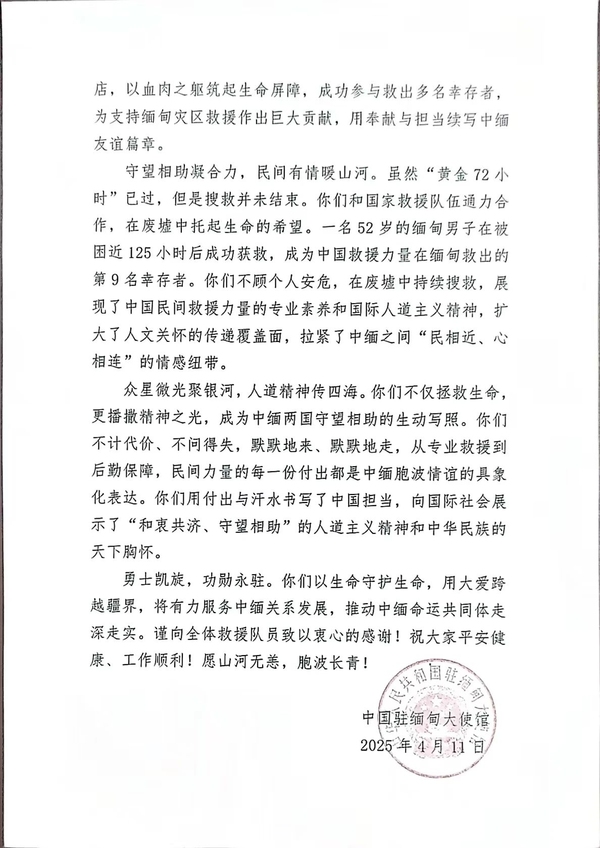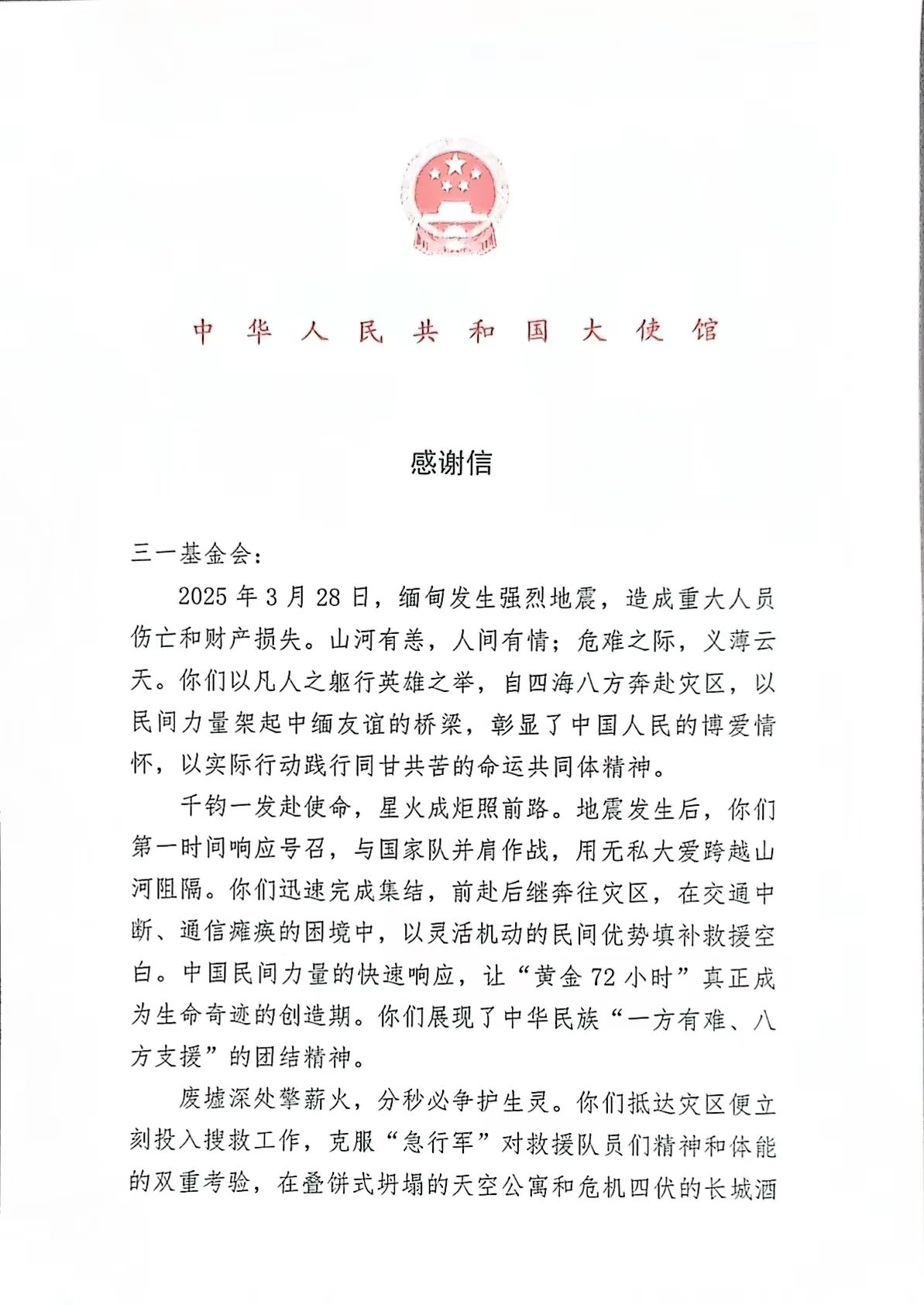 近日,中国驻缅甸大使馆向好体育投注官网发来感谢信,高度认可好体育投注官网基金会在缅甸地震后的救援行动。信中指出,好体育投注官网 “第一时间响应号召,与国家队并肩作战,以无私大爱跨越山河阻隔”,并表扬 “以血肉之躯筑起生命屏障,成功救出多名幸存者” 的奉献担当。