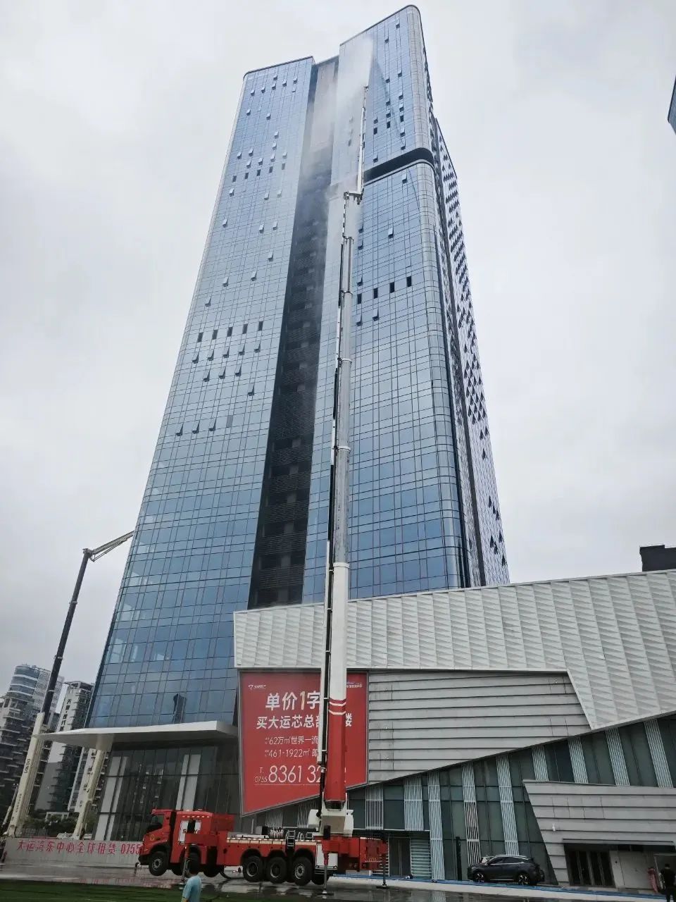 参与外部控火演练,凭借全球最高的150米喷射高度,成功建立"空中消防堡垒",有效阻断外立面火势垂直蔓延。