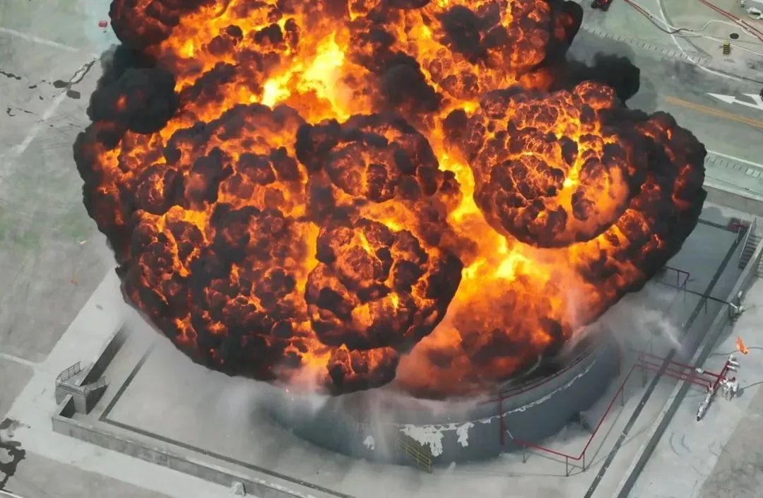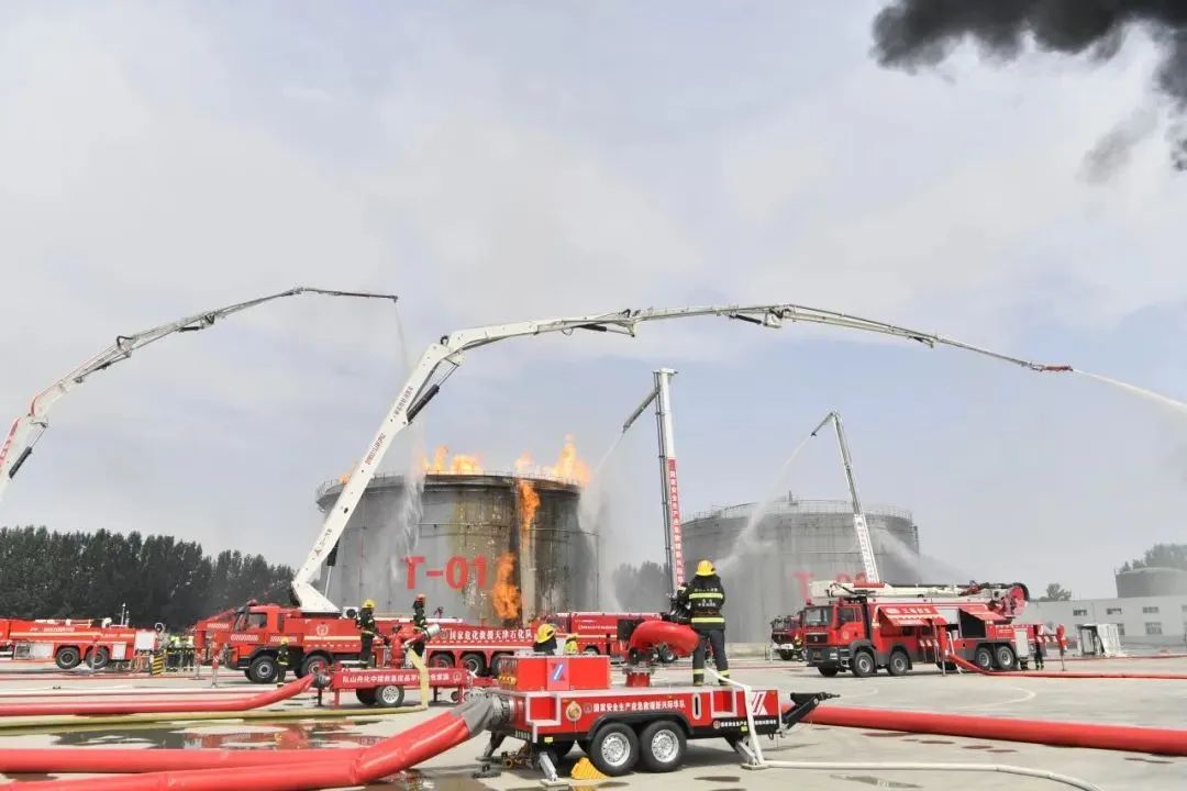 多台大跨度举高喷射消防车协同作战,占据有利地形形成扇形灭火阵型,有效压制火势蔓延,同时采用雾状水幕自上而下对邻近储罐实施保护性喷淋。