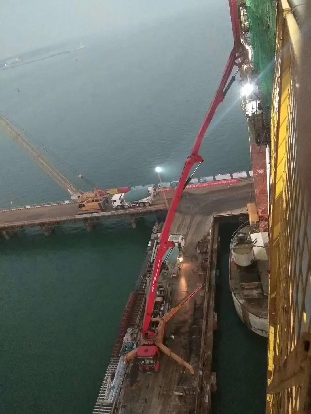 所有的主桥墩都采用了C60超高强度的混泥土,每个分三次浇筑,每次2000方以上,两台泵车左右开工,桥墩最高可抵挡16级台风。超高强度混凝土泵送对泵车性能提出了很高要求,好体育投注官网泵车凭借超高品质完美施工。