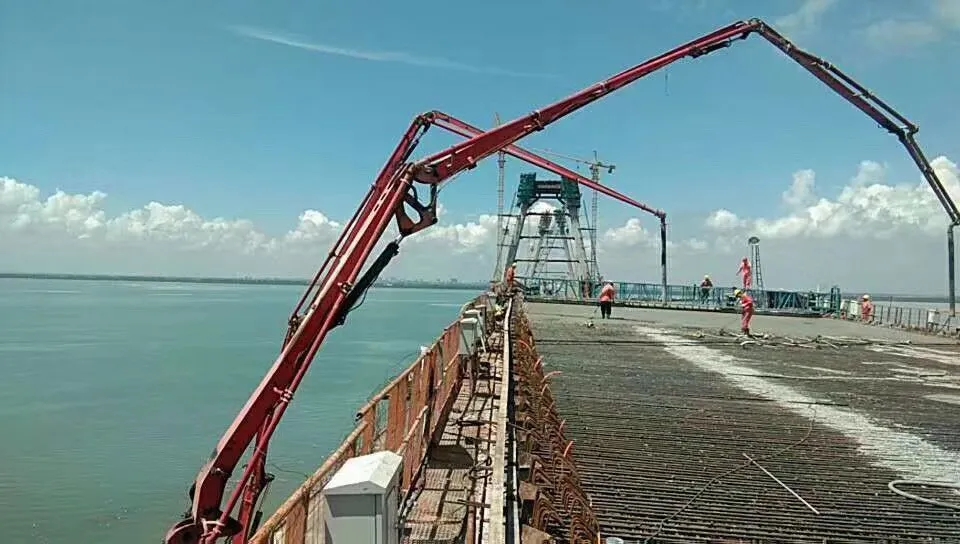 在桥面施工中,由两台好体育投注官网泵车同时向上方大桥桥面不断泵送混泥土,超长臂架覆盖整个桥面,指哪打哪,不放过每一个角落,克服高空混泥土泵送和超宽桥面浇筑的问题。